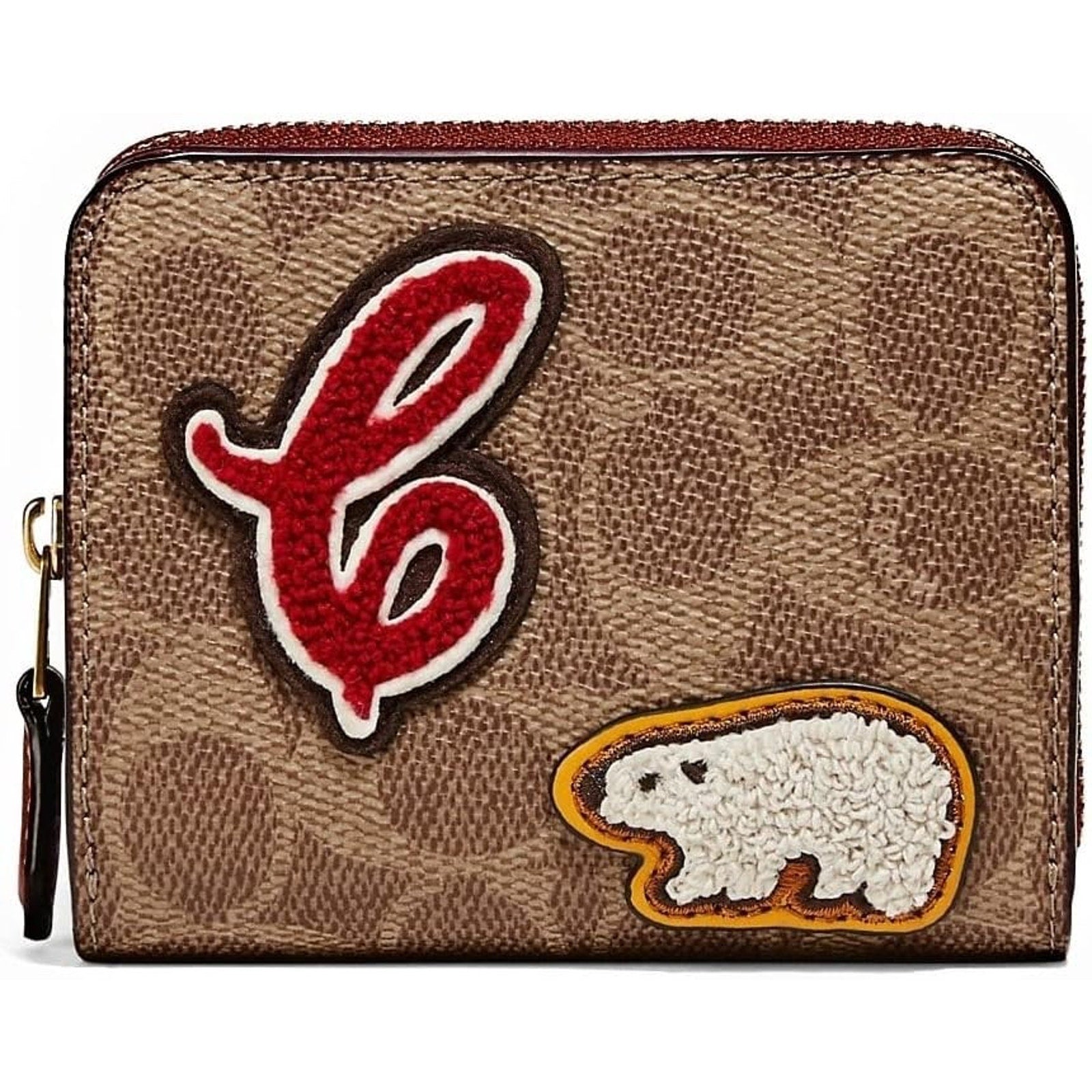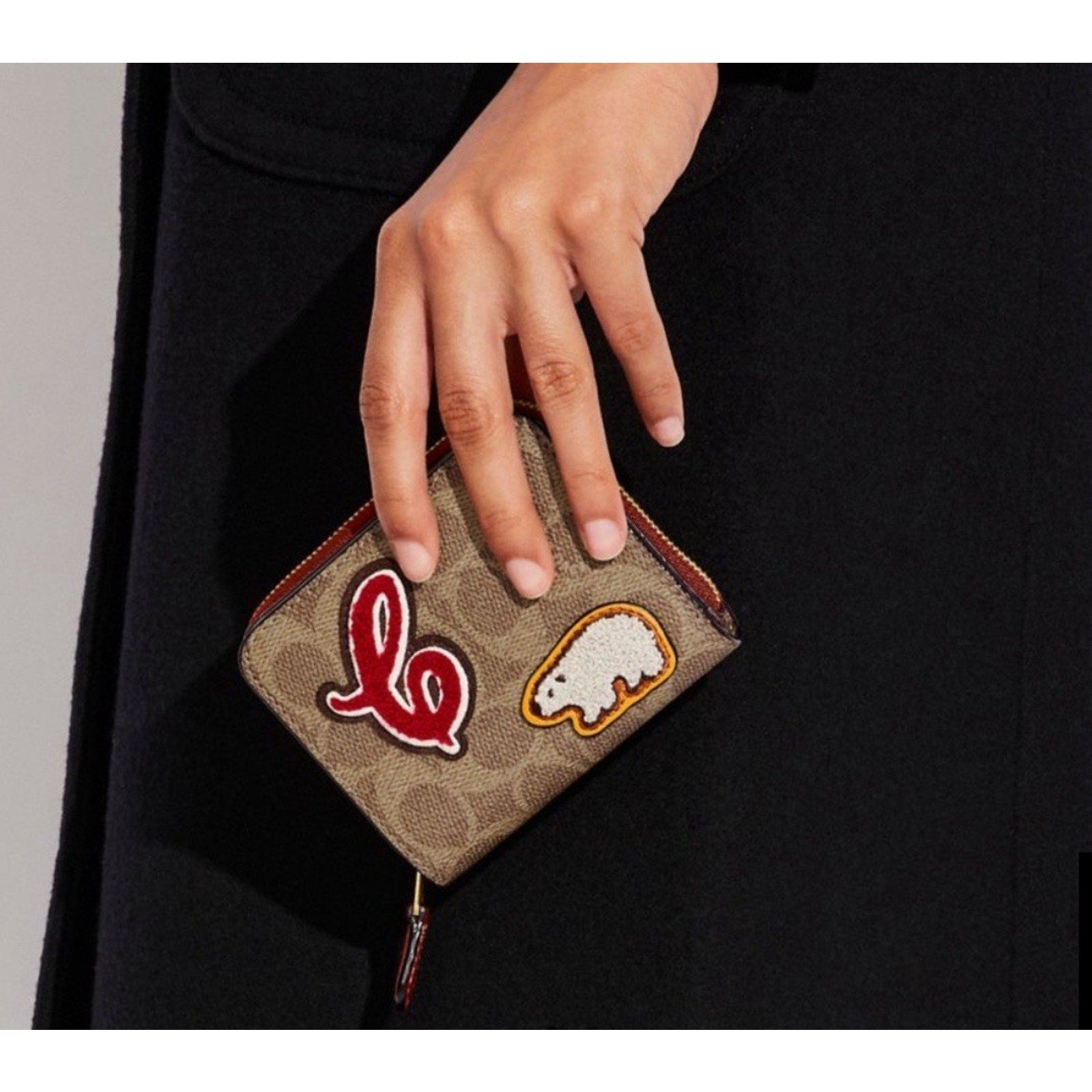 This COACH billfold wallet combines iconic signature canvas with a standout pair of varsity-style patches that give it real character. The design features a bold chenille “C” and, most notably, a textured polar bear patch crafted in looped embroidery. The bear adds a unique, collectible touch rarely seen on COACH’s small leather goods — a playful detail that sets this wallet apart from standard monogram pieces.