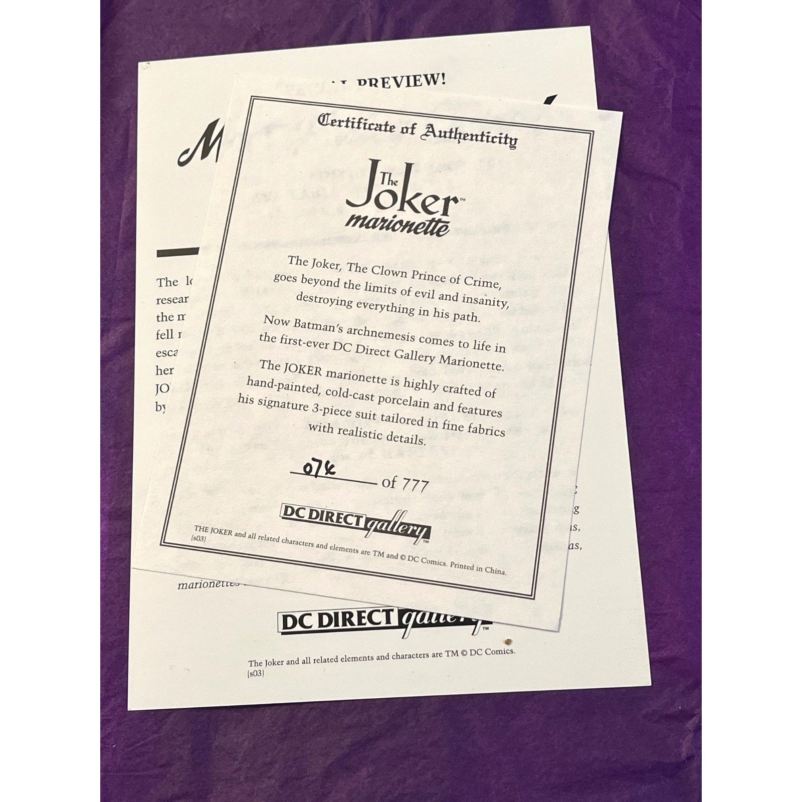 This is an exceptional example of the Joker Marionette—never removed from packaging, perfectly preserved for over 20 years, and complete with all original components and paperwork. Low-number editions like #074/777 rarely surface in this condition. For serious DC Direct collectors, this is the type of piece you wait years to find.