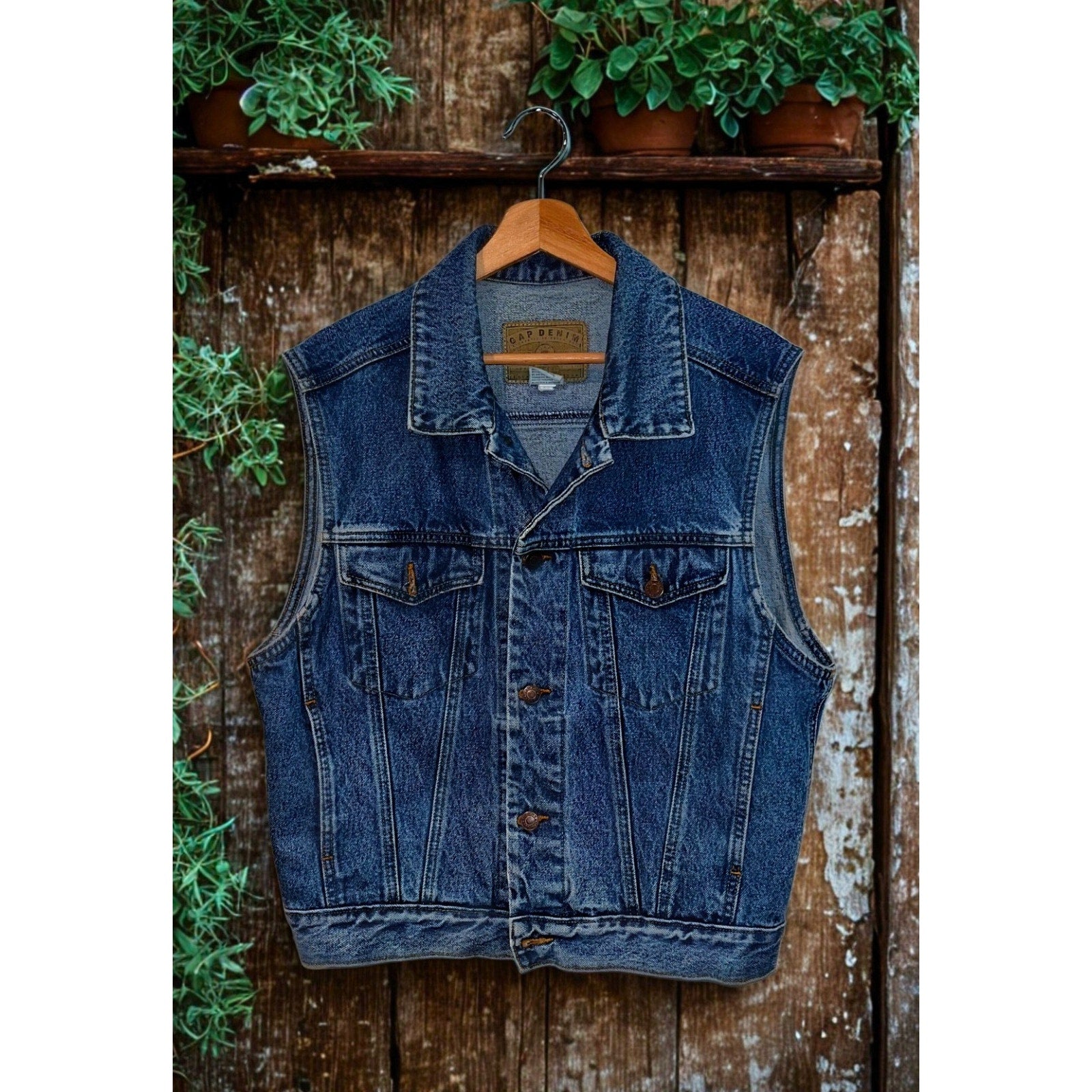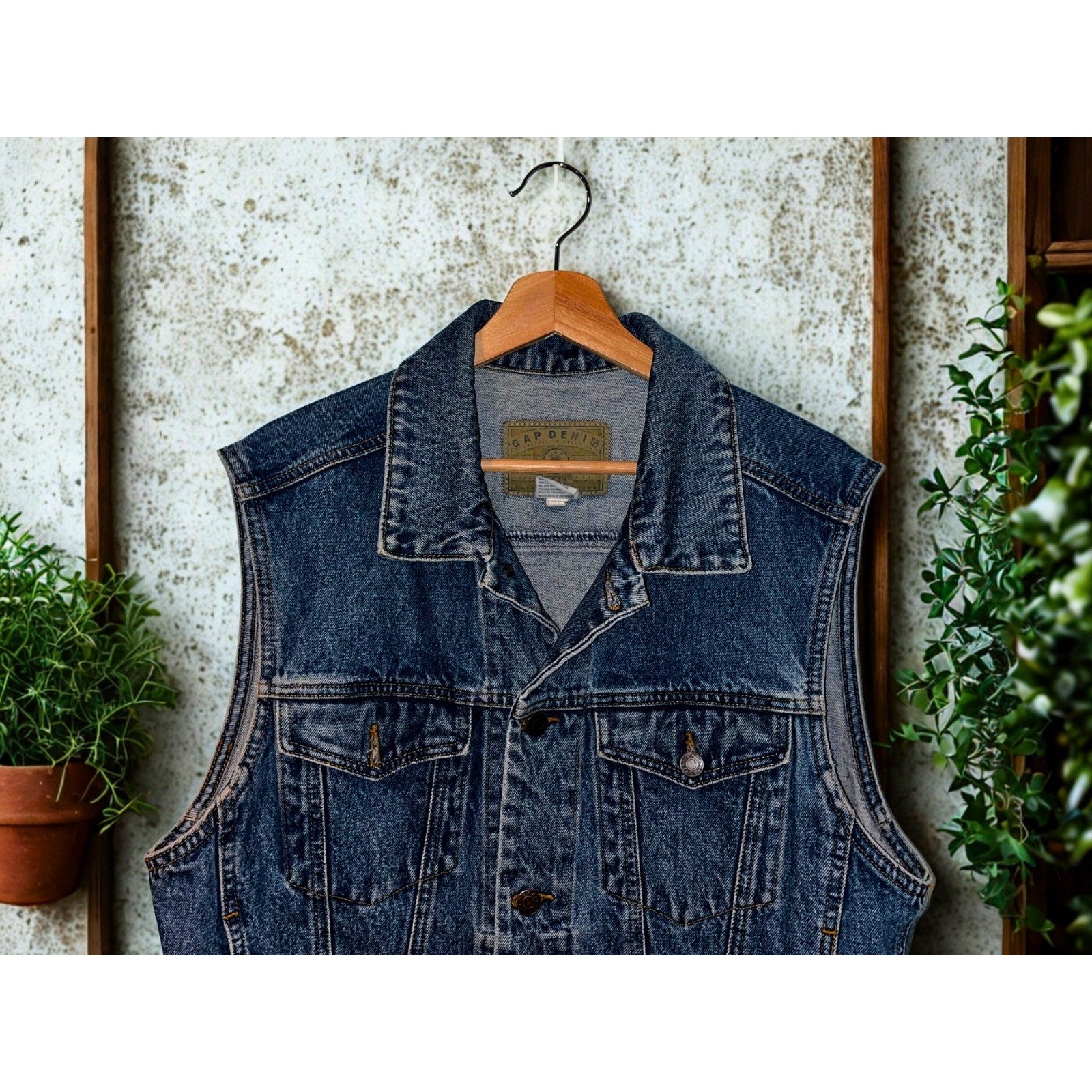 Classic GAP Denim Vest from the 1990s — a timeless blue jean trucker style built with durable 100% cotton. This vintage piece embodies that perfectly faded medium wash and rugged Y2K grunge aesthetic that pairs effortlessly with hoodies, flannels, or tees.