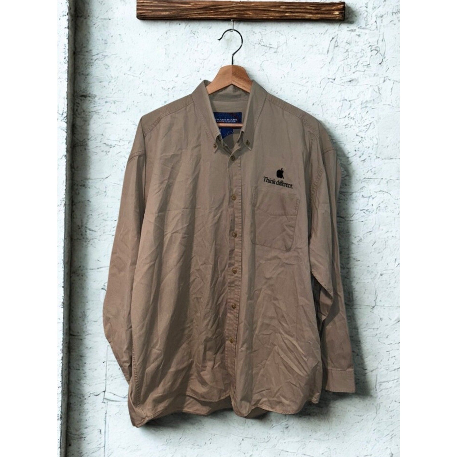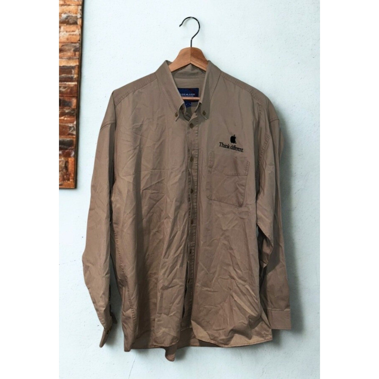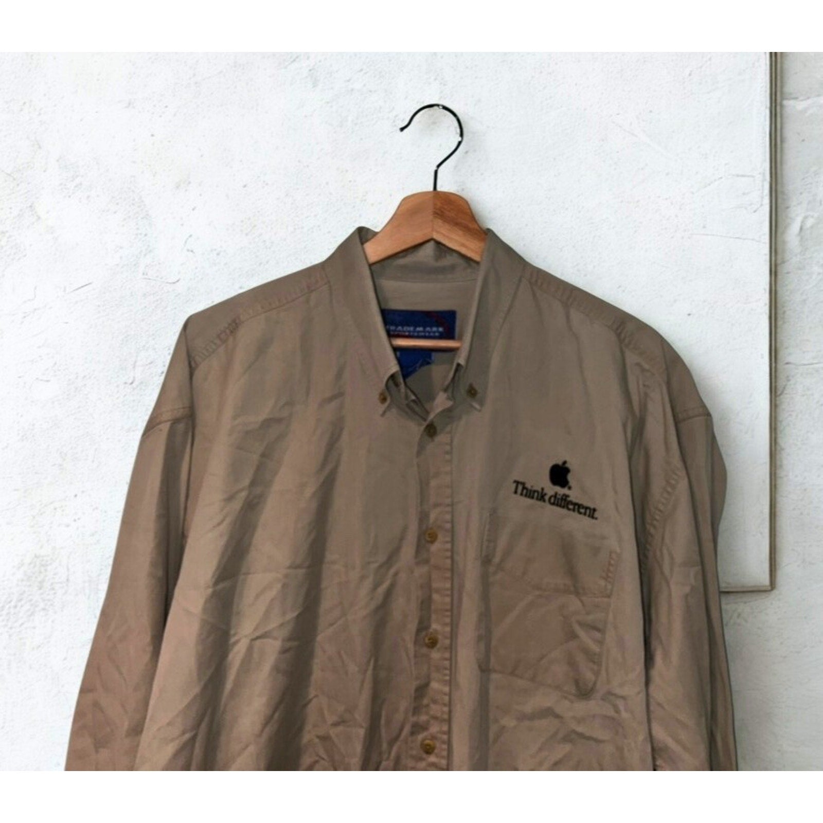 This tan long-sleeve button-down features the iconic black Apple logo and “Think different.” slogan embroidered on the chest — the hallmark of one of the most celebrated ad campaigns in history. Crafted from 100% cotton by Trademark Sportswear, this shirt was never sold to the public. It was distributed exclusively to Apple corporate employees at Cupertino headquarters, those who worked alongside Steve Jobs during his legendary return to the company.
