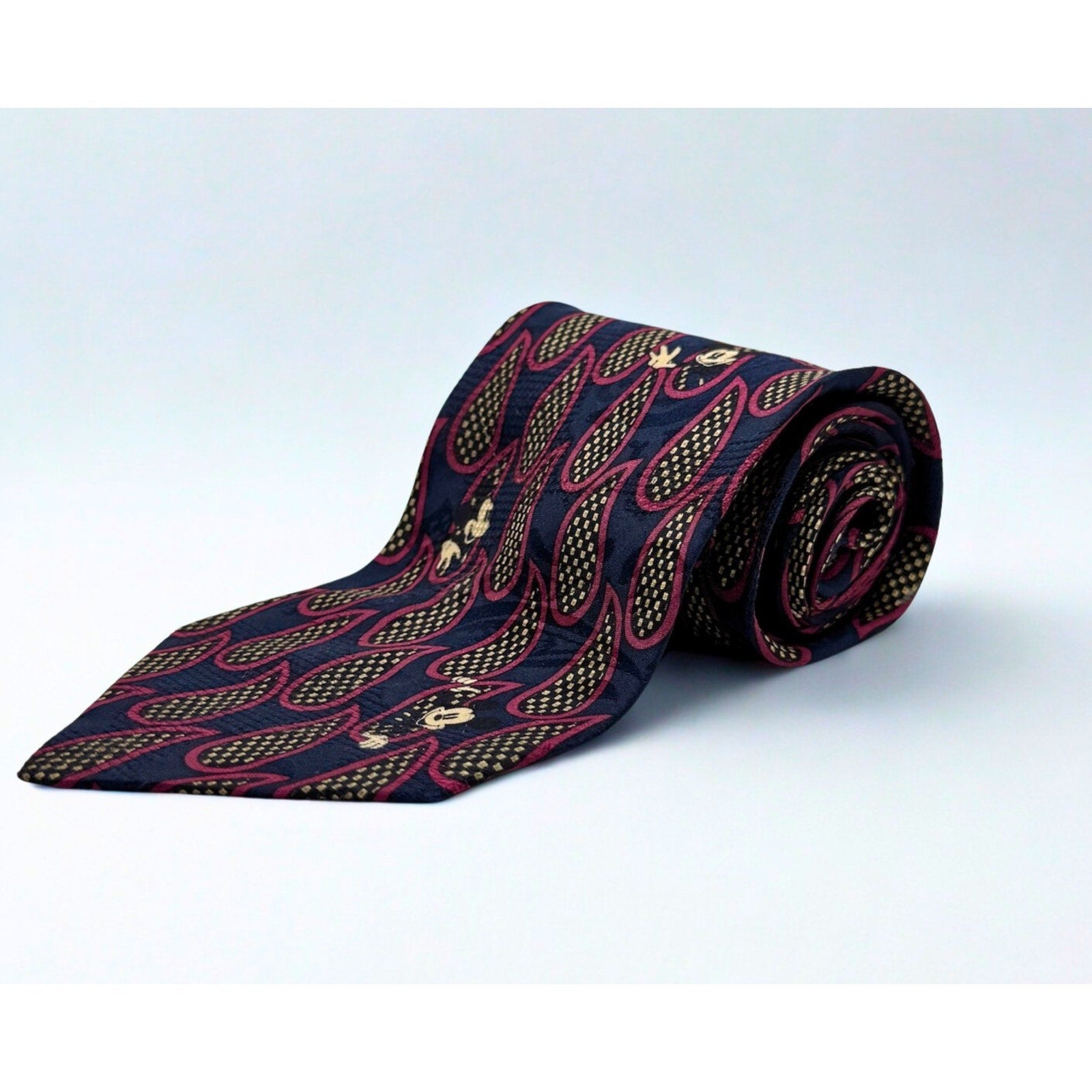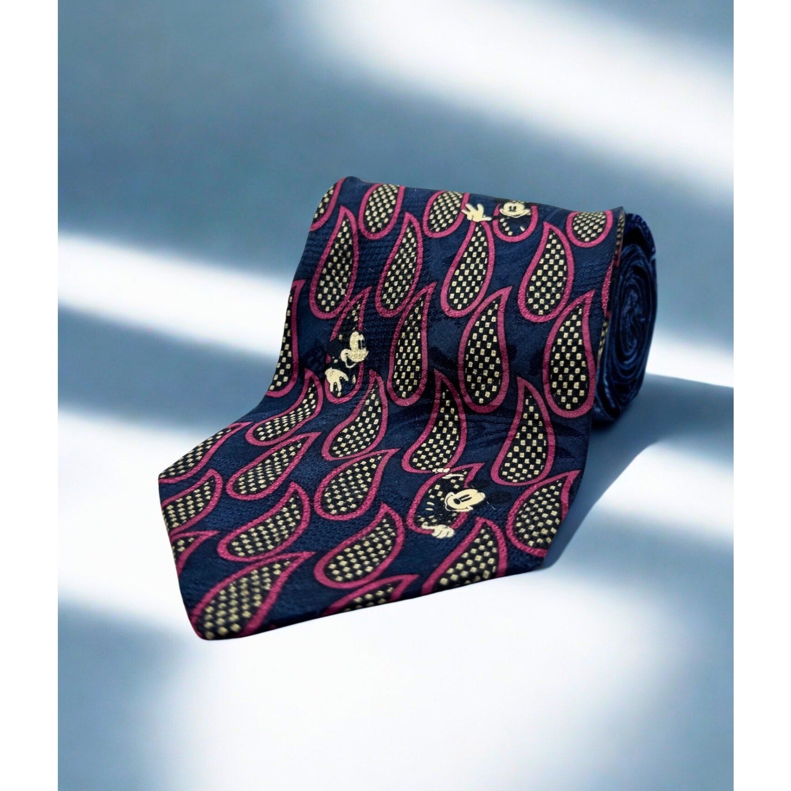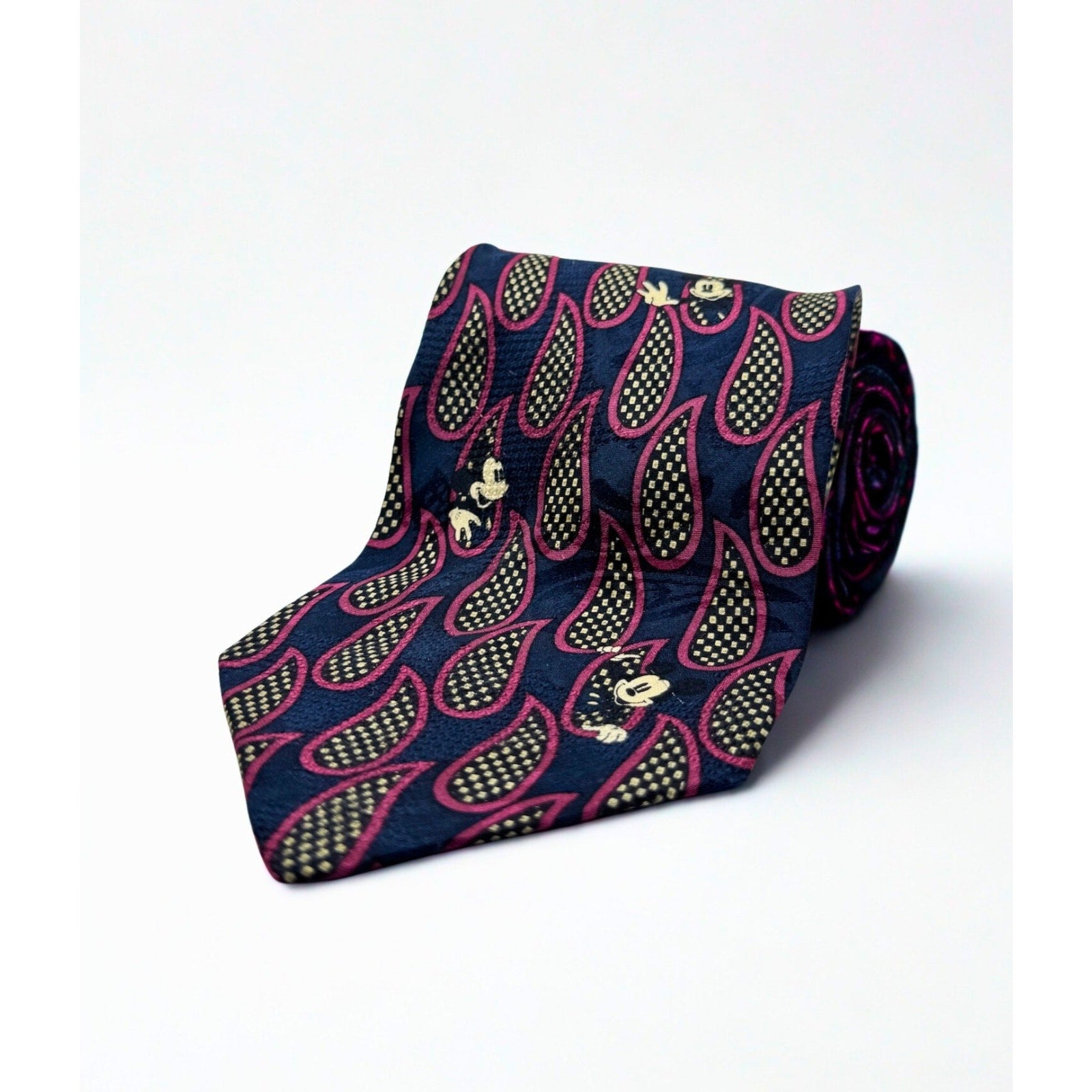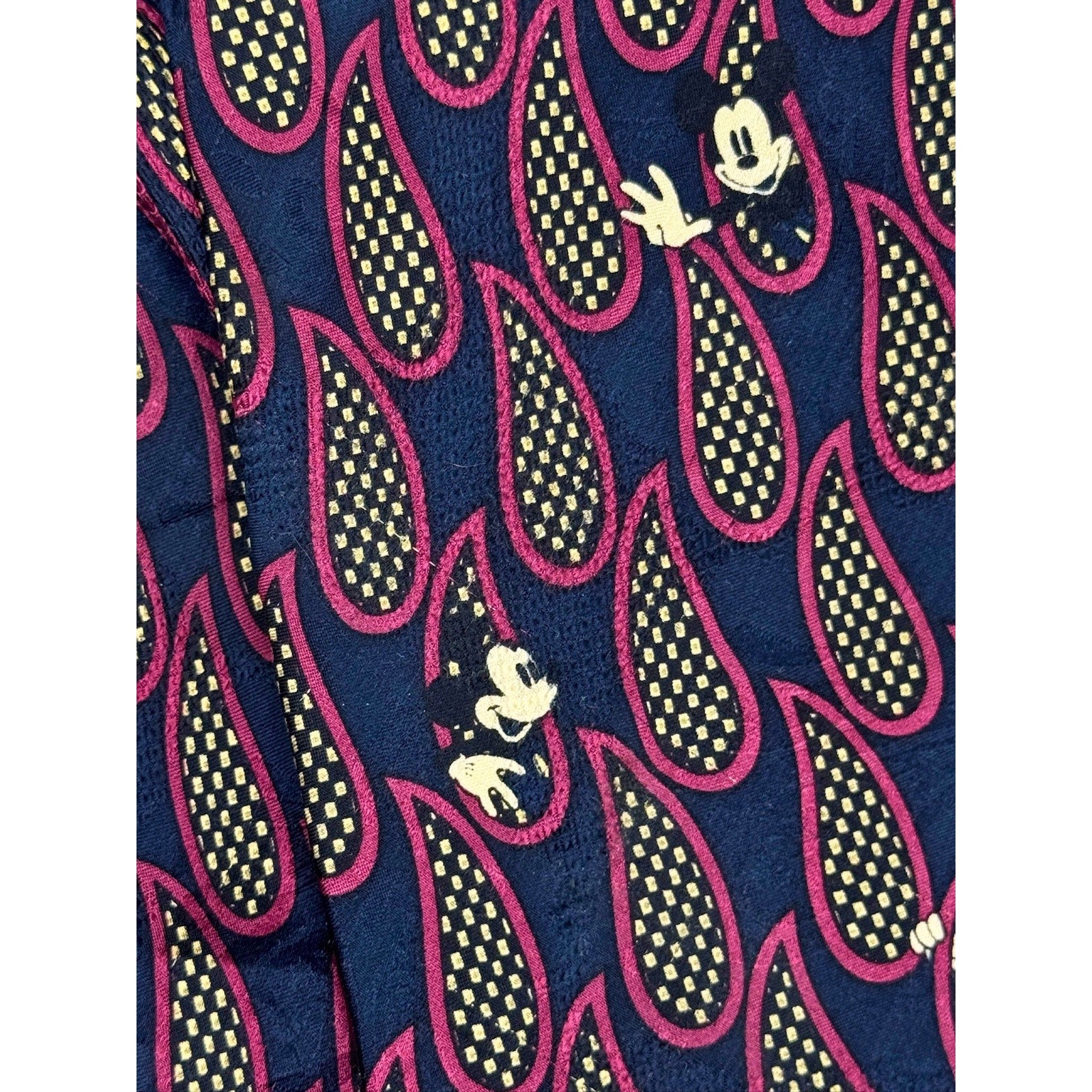 Add a touch of classic Disney charm to your wardrobe with this vintage Mickey Inc silk tie. Featuring a unique hidden Mickey design woven into a bold patterned background, this tie is both playful and sophisticated—perfect for Disney fans and collectors alike.