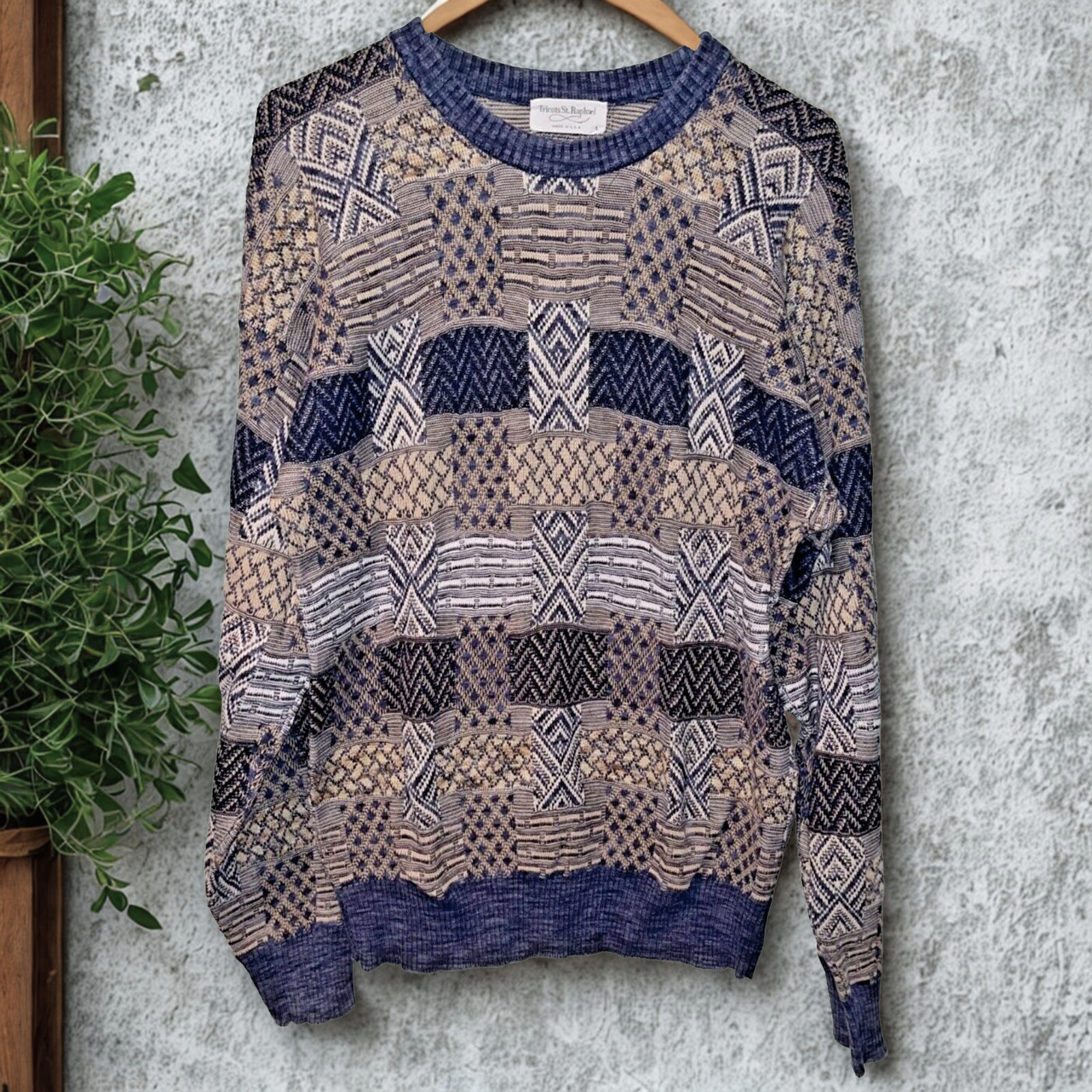 Wrap yourself in the cozy comfort of the Tricots St. Raphael Geometric Textured Knit Sweater, a Coogi style vintage-inspired piece that brings a touch of the '80s and '90s to your wardrobe. The classic crew neck and long sleeves make it a versatile addition for your casual, party, or travel outfits. With its unique multicolored geometric pattern, this tight-knit sweater is sure to make a statement whether you're hitting the town or just enjoying a casual walk. Crafted from cotton and made in the United States, this size large sweater boasts a timeless design with a modern twist. The textured knit accentuates its vintage charm, while the classic fit ensures it's a comfortable choice for unisex adults. Machine washable for easy care, this piece is a practical and stylish addition to any collection.