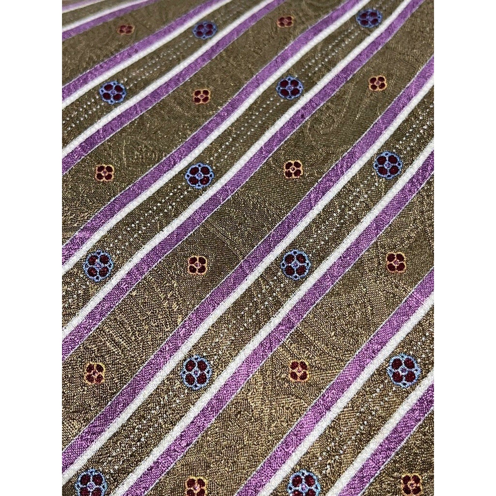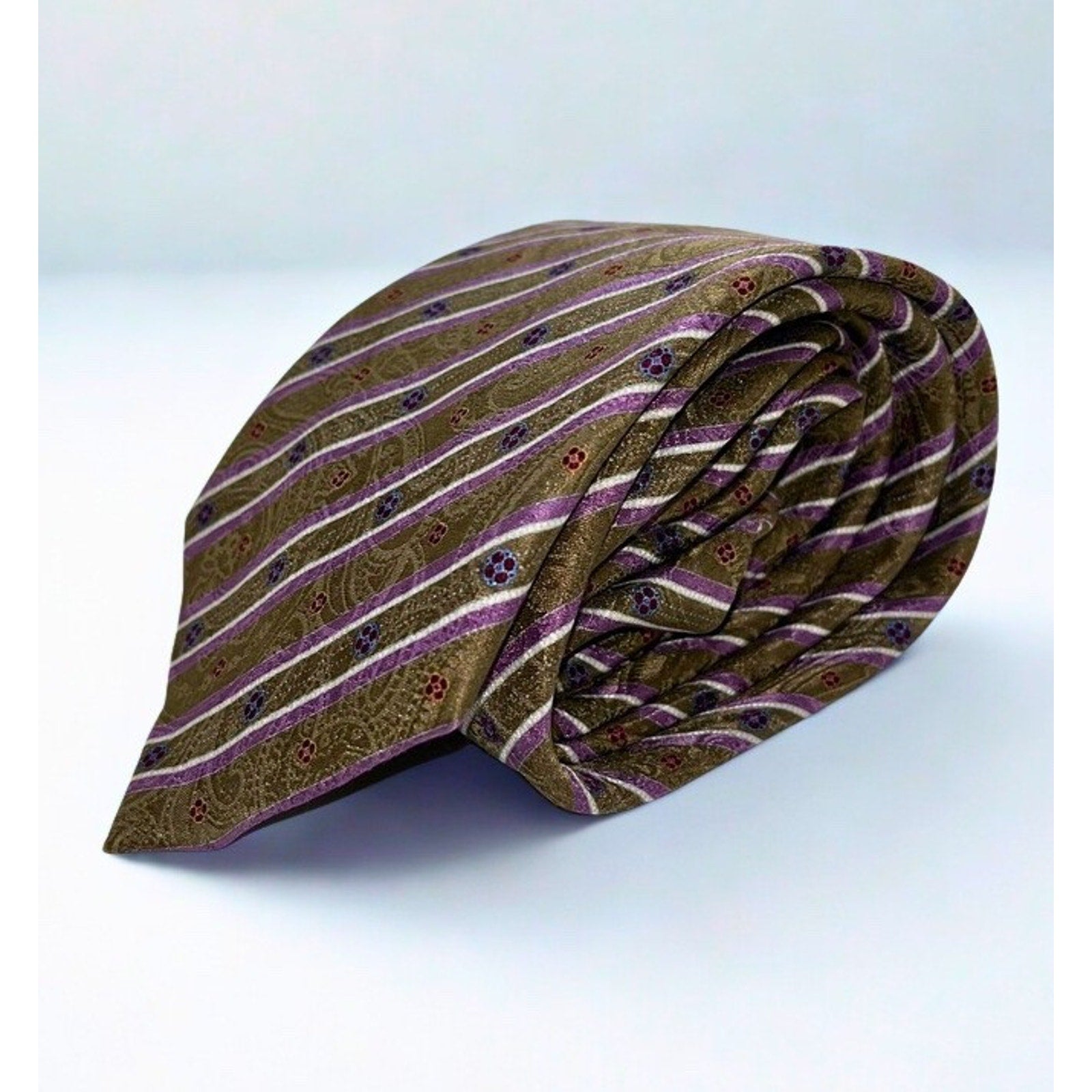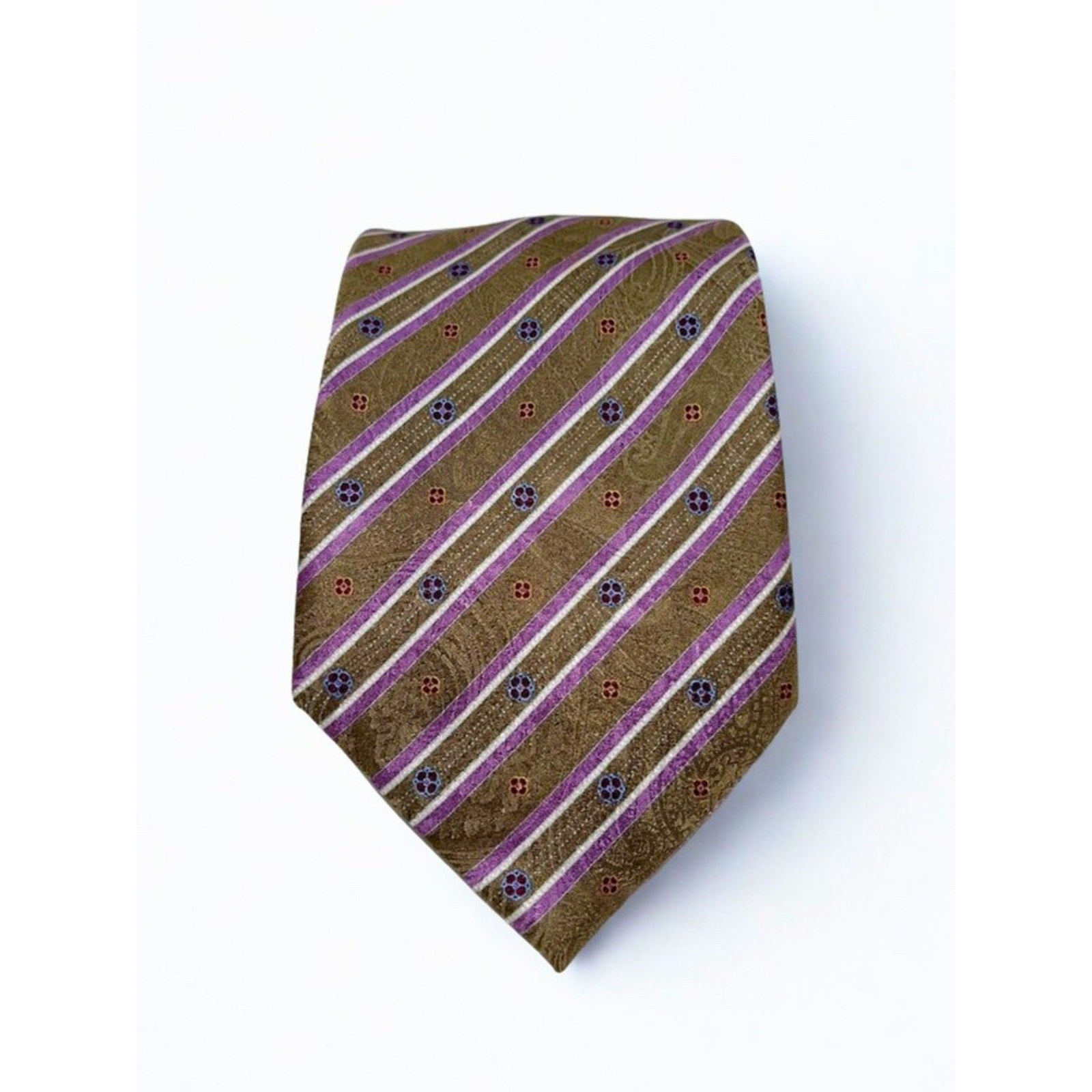 The design features a rich olive-brown base with an elegant paisley jacquard weave, layered with diagonal lavender and ivory stripes. Interspersed throughout are small geometric medallions in burgundy and blue, adding depth and sophistication without overpowering the look. Finished with a satin-like glossy sheen, this tie catches the light beautifully, making it equally at home in the boardroom or at a formal evening event.