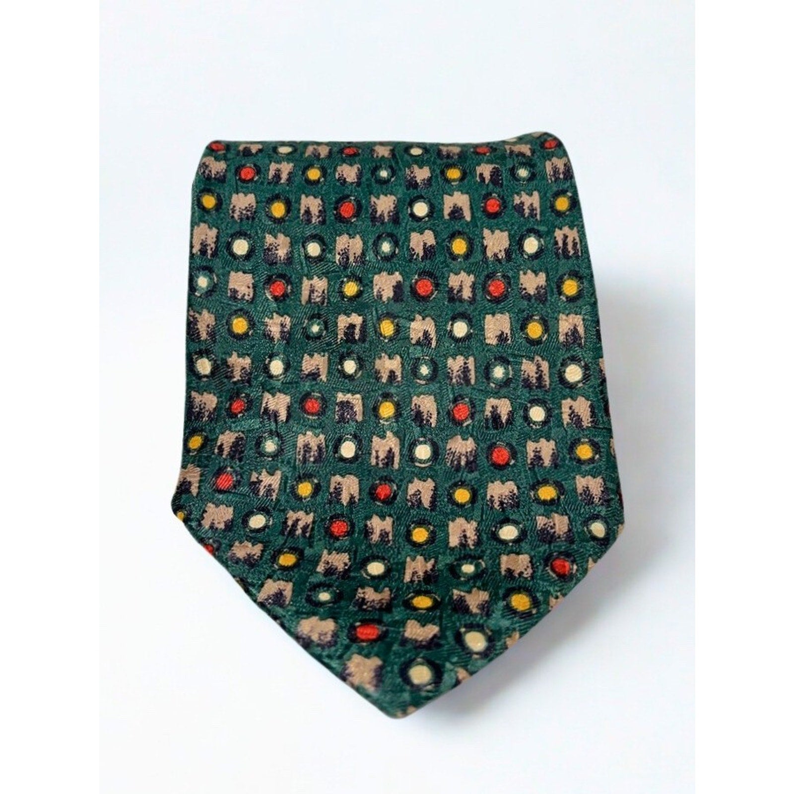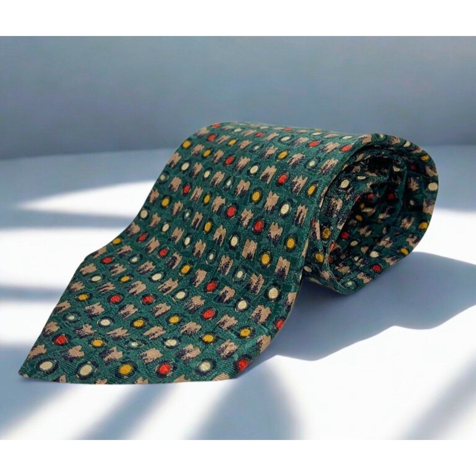 Refined and understated, this Ermenegildo Zegna Soft 100% silk tie features an abstract geometric dot-and-block pattern arranged in a tight, repeating grid. The design blends deep forest green with tan, gold, red, and ivory accents, offering subtle visual texture while remaining elegant and versatile.