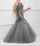 Trompetenkleid aus metallischer Spitze über Tüll mit leichten Flügelärmeln, tiefem herzförmigem Ausschnitt mit Illusionseinsatz, leichtem V-Rücken, tiefer Taille, gewelltem Saum und geschwungener Schleppe.