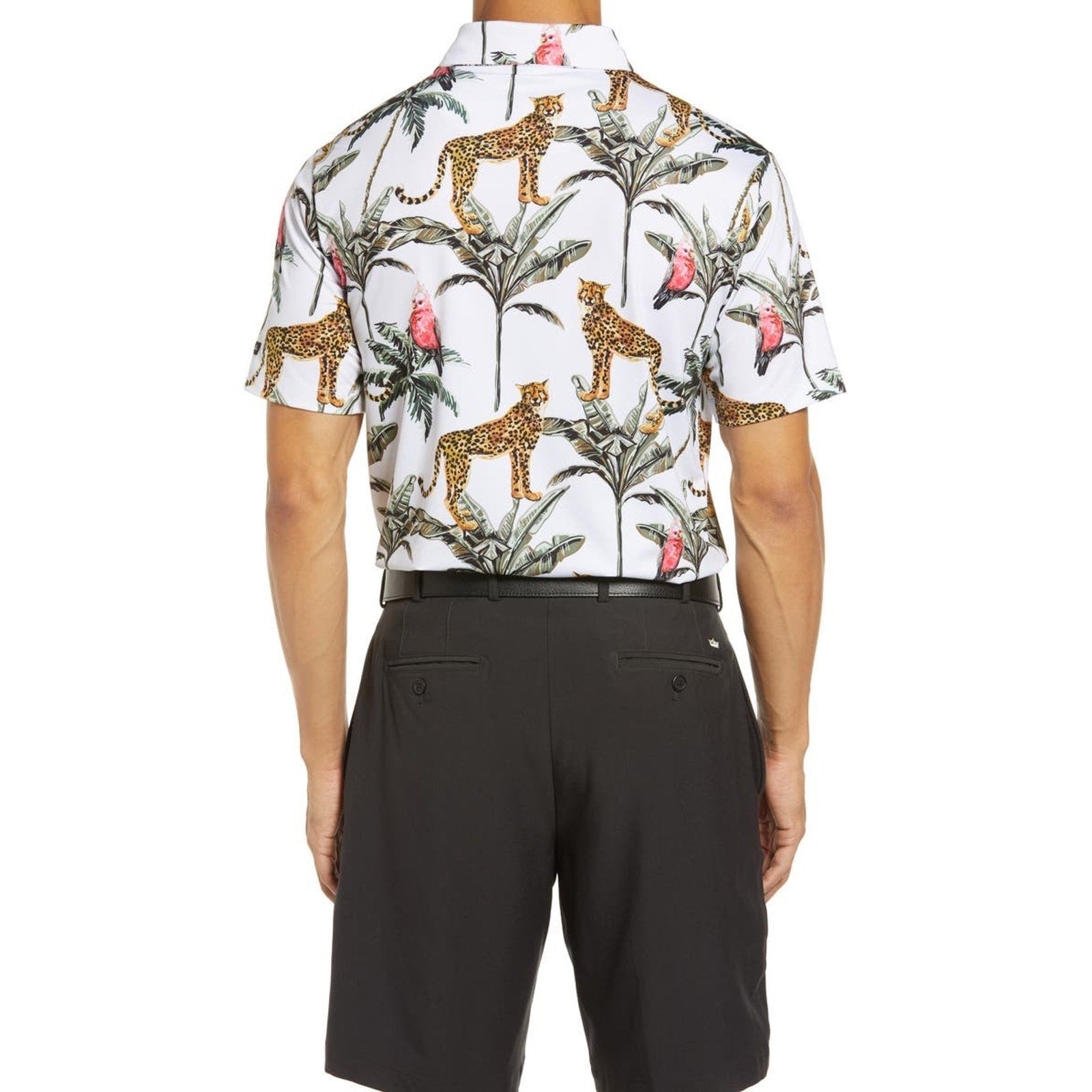 Designed with a lightweight, breathable performance fabric, this polo offers stretch and comfort ideal for long days on the course or casual wear off the fairway. The vibrant animal and tropical motif makes this shirt a standout, perfect for golfers who appreciate individuality and statement style.