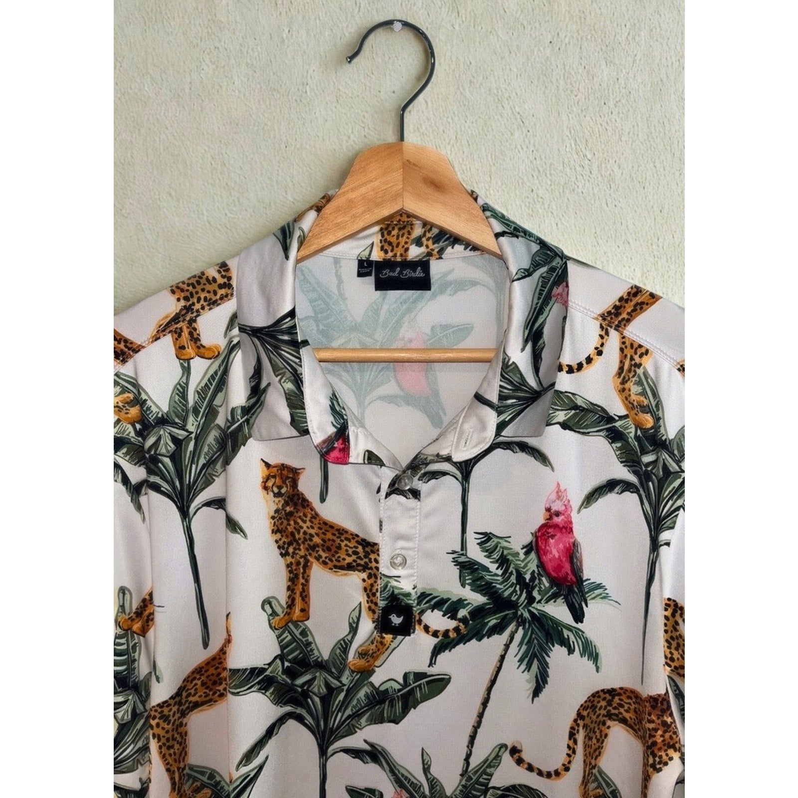Bad Birdie Golf Polo Shirt Mens Large NWOT Hawaiian Cheetah Parrot Palm Print