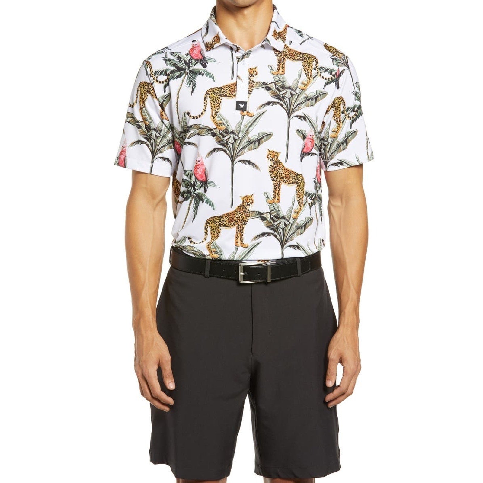 This Bad Birdie men’s golf polo showcases the brand’s signature blend of modern performance and bold personality. Featuring a striking Hawaiian-inspired all-over print with cheetahs, parrots, and palm trees, this piece embodies Bad Birdie’s mission to break traditional golf fashion norms while maintaining top-tier functionality.