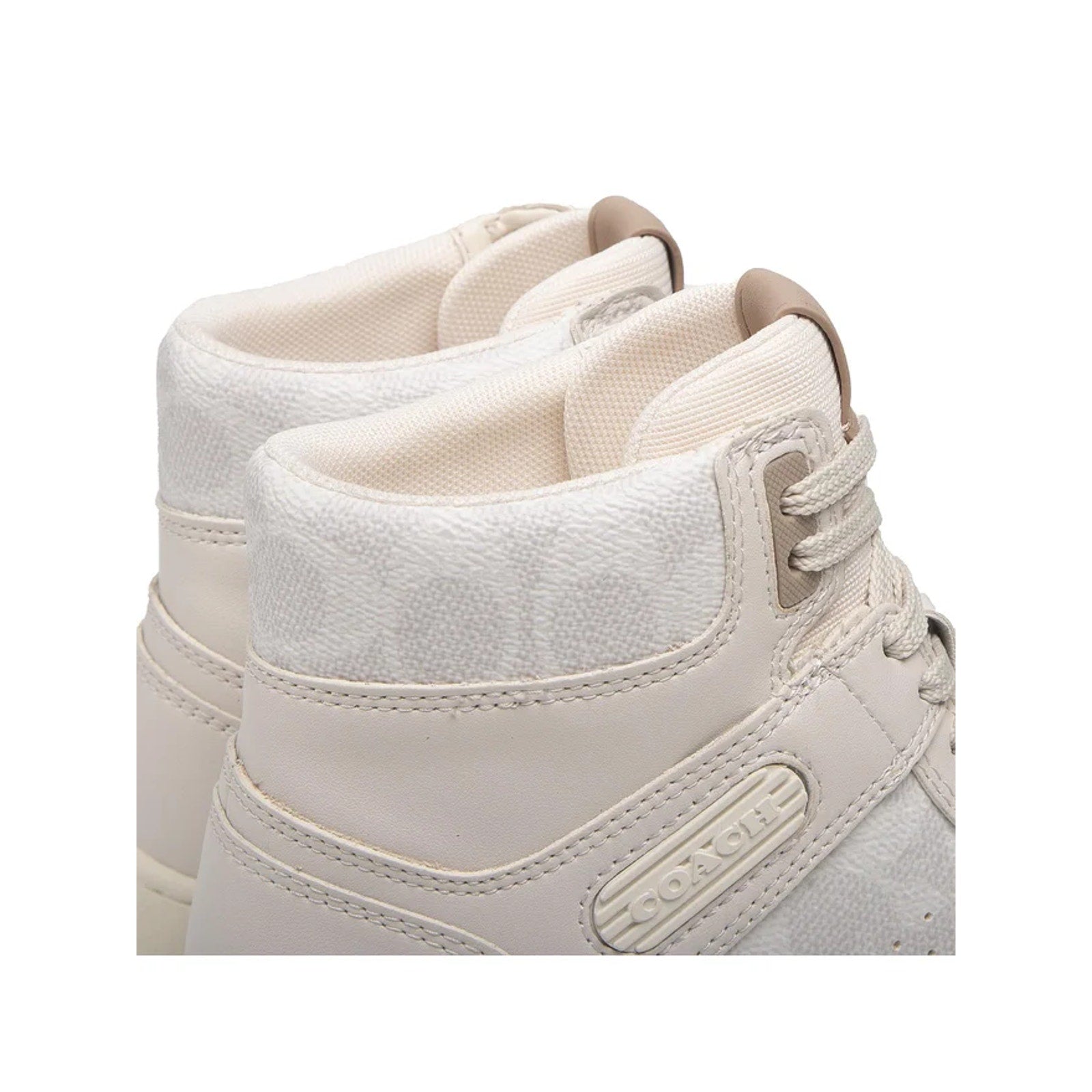 Add luxury streetwear style to your wardrobe with these Coach Hi Top Sneakers (Style CD304) in Chalk Coated Canvas. Featuring a durable coated canvas upper with leather trim, these sneakers offer a clean, modern look with everyday comfort.