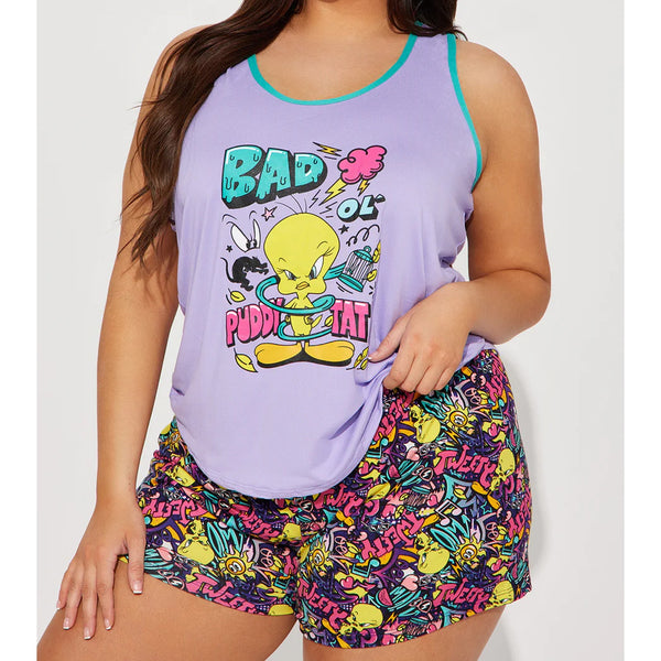 This Looney Tunes Tweety Bird Bad Ol Buddy Tat Racer Back Tank Top is a must-have for any fan of the classic cartoon. Made from a blend of polyester, spandex, and polyester blend jersey fabric, this sleeveless tank top features a round neck and racerback strap type. The colorful multicolor design is perfect for casual occasions and can be worn in any season. The tank top is machine washable and lightweight, making it easy to care for and comfortable to wear. The classic fit and breathable fabric make it a great addition to any wardrobe. This Looney Tunes tank top is perfect for women who want a basic, yet stylish top to add to their collection.