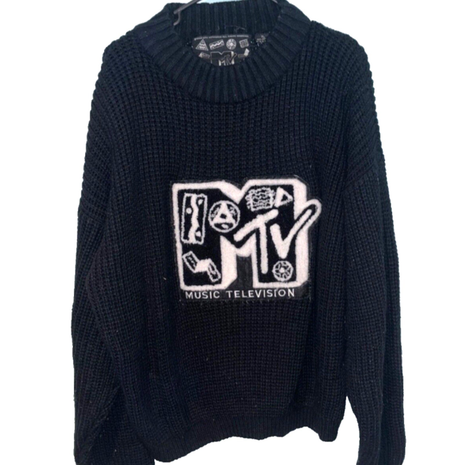 MTV Sweater Cable Knit 1989 Music Grunge Vintage Black Sz. XL