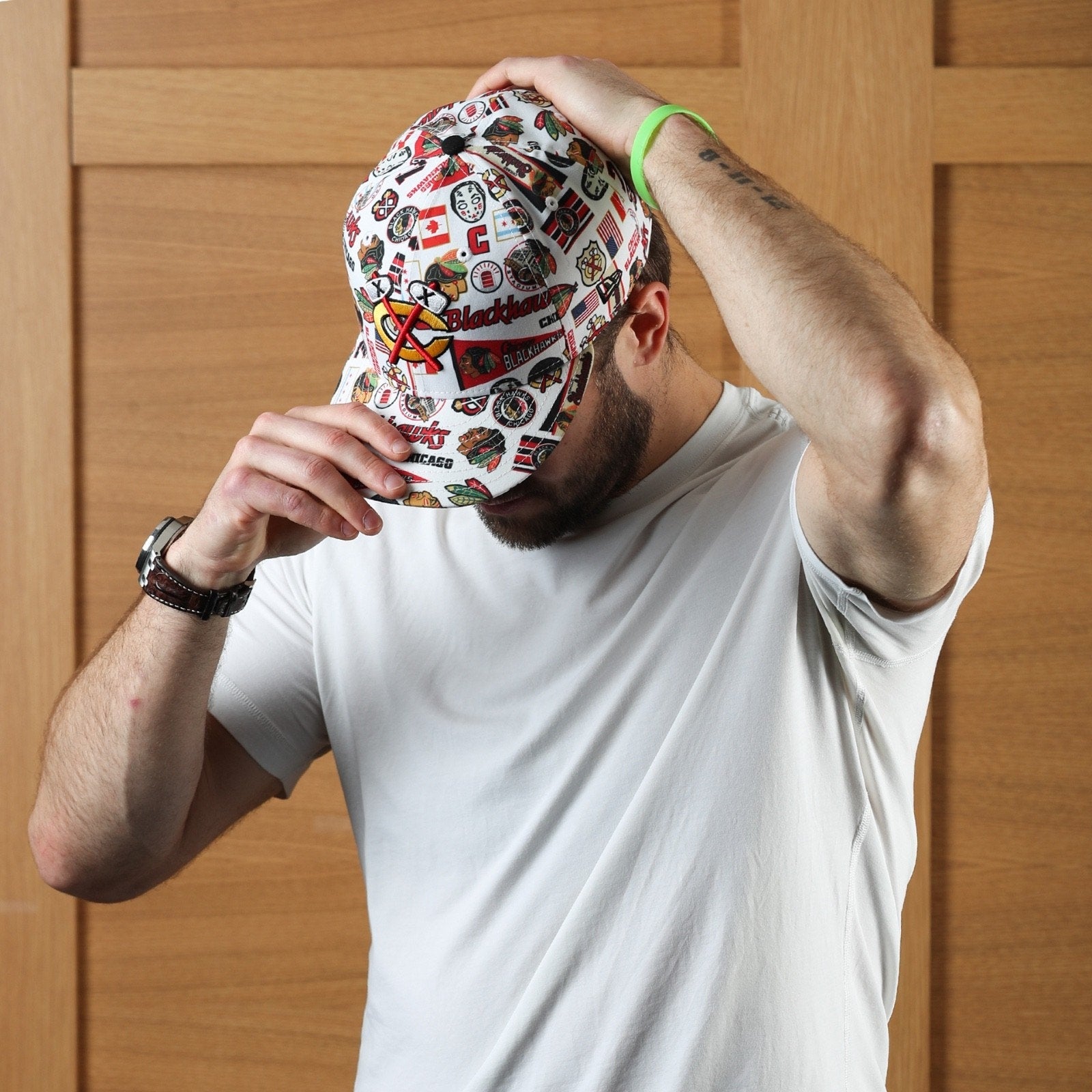 This striking collector’s cap showcases an all-over Chicago Blackhawks print, featuring vintage and modern team graphics, flags, and logos. Front embroidery displays the team’s crossed-tomahawk crest, while inside you’ll find a custom “Designed by Brent Seabrook” label with his signature and number.