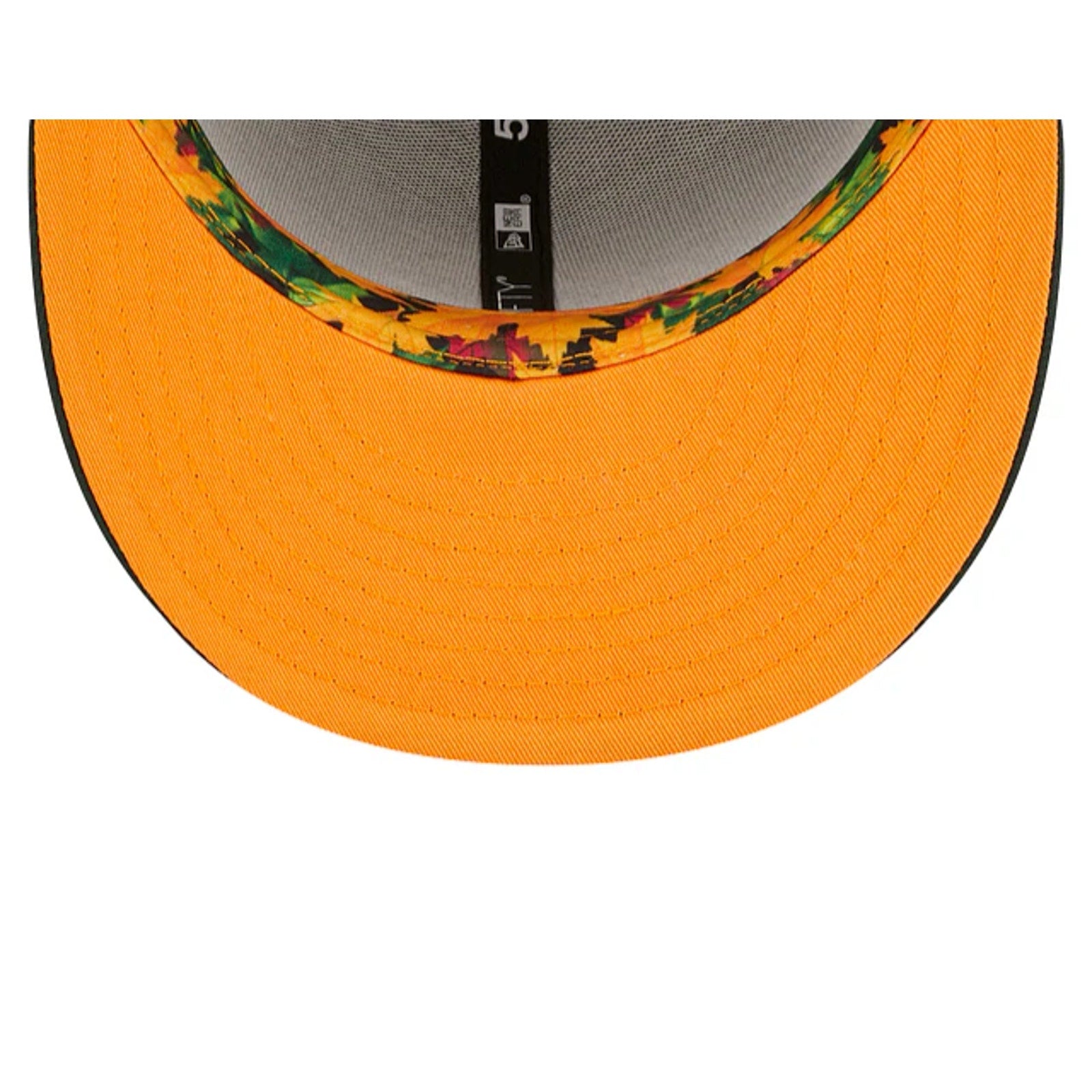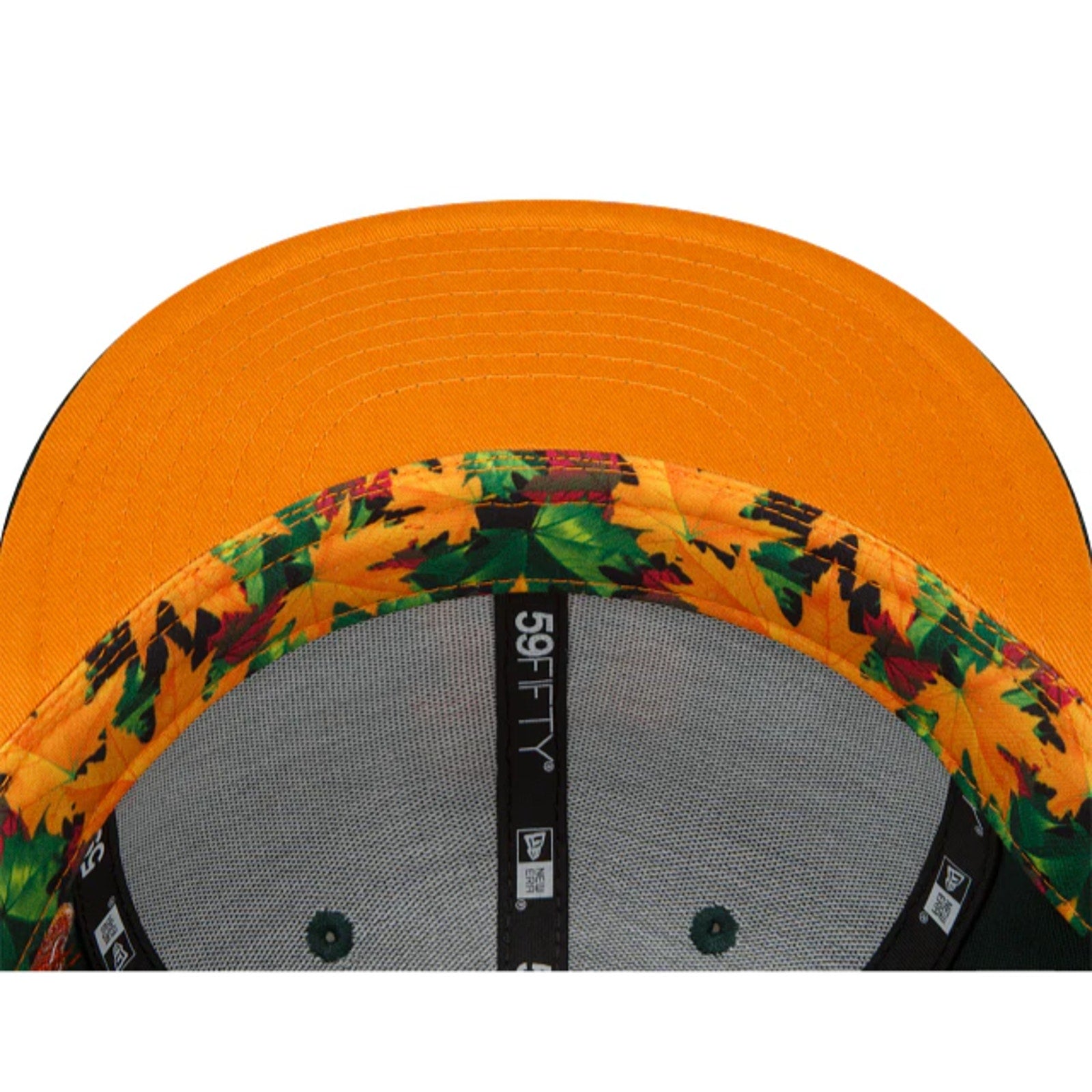 The Los Angeles Dodgers Leafy 59FIFTY Fitted Cap features an embroidered Dodgers logo on the front panel, a 1988 World Series patch at the right-wear side, and a matching MLB Batterman logo at the rear. Additional details include an orange undervisor and autumn leaf patterned sweatband.
