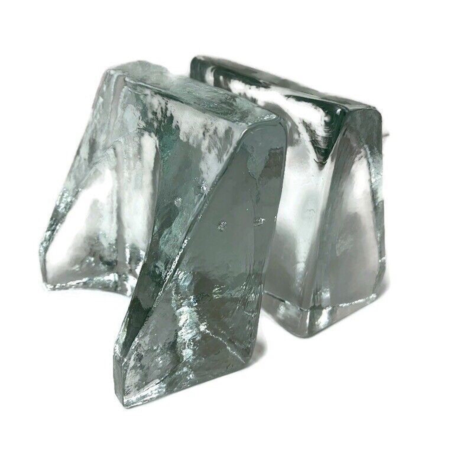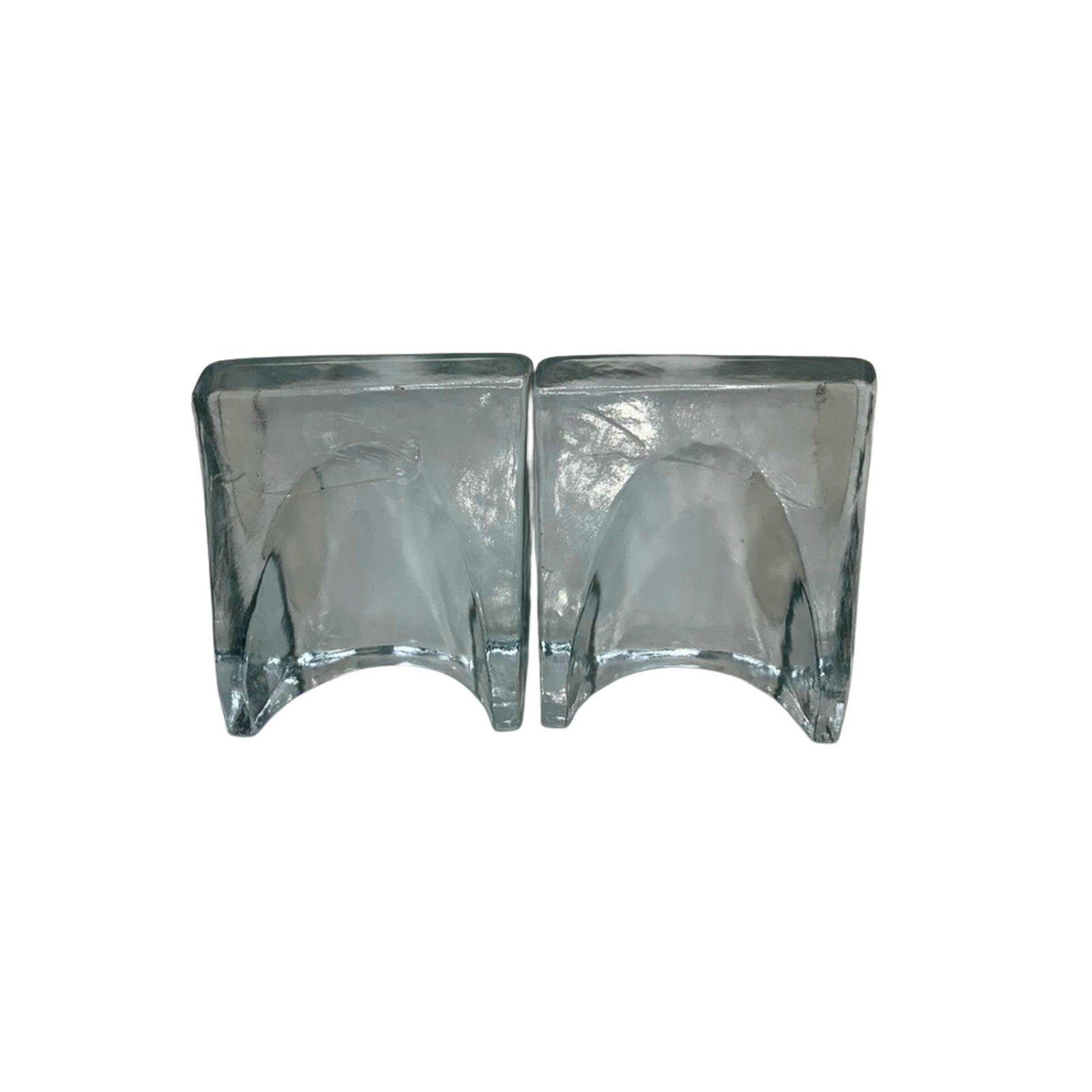 "BLENKO by Wayne Husted Sculptural Wedge Bookends are a striking piece of mid-century modern art glass. These triangular bookends feature a clear glass design with a textured finish, embodying the abstract art style of the 1960s. The unique sculpture showcases the minimalist and sleek aesthetic of the era, making it a perfect decorative collectible for adults who appreciate vintage design."
