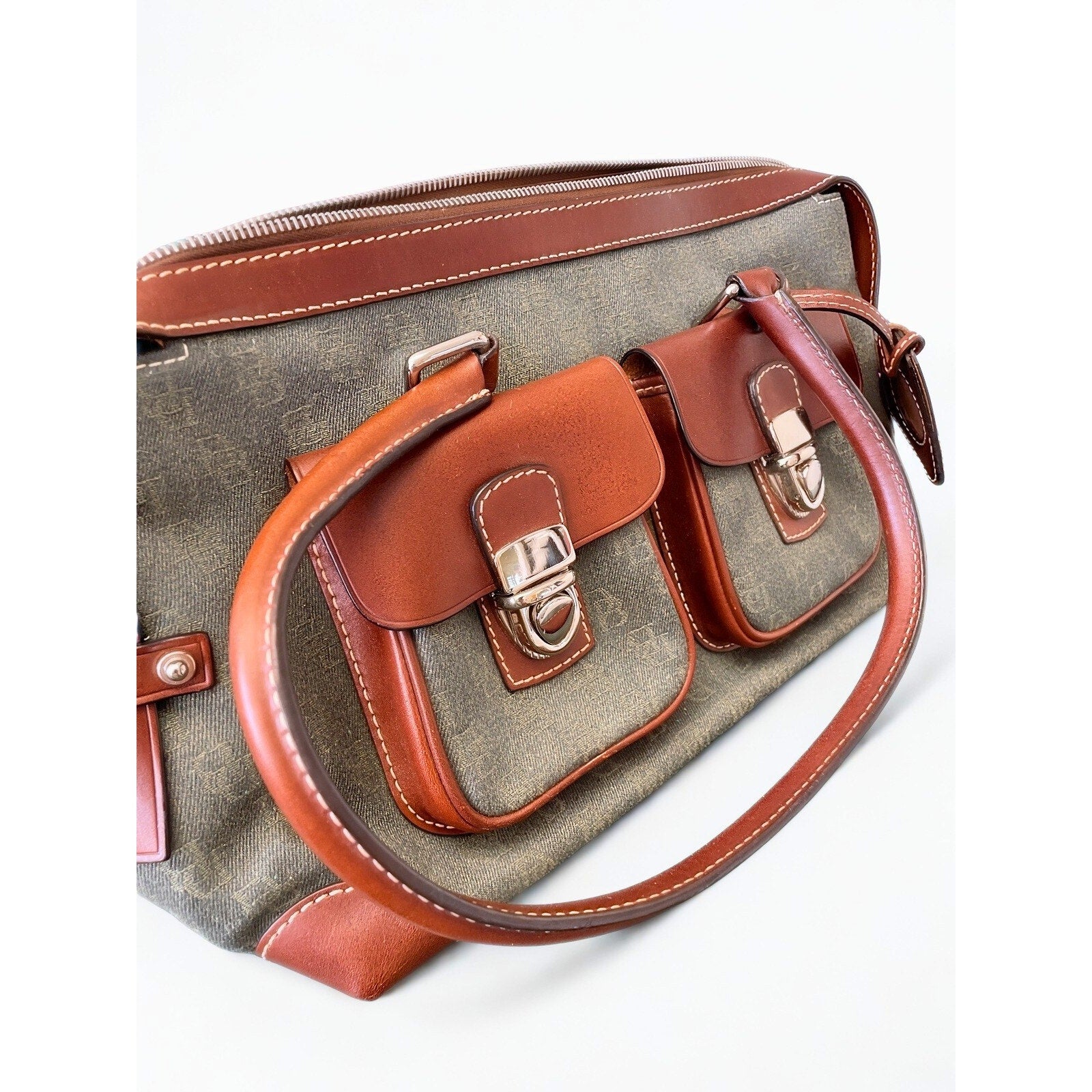 Rare and collectible Vintage Dooney & Bourke Double Pocket Tote (Style HP65C, Hunter Green). This piece features Dooney’s signature monogram canvas with Vacchetta leather trim and dual front buckle pockets — a functional and eye-catching design no longer in production.