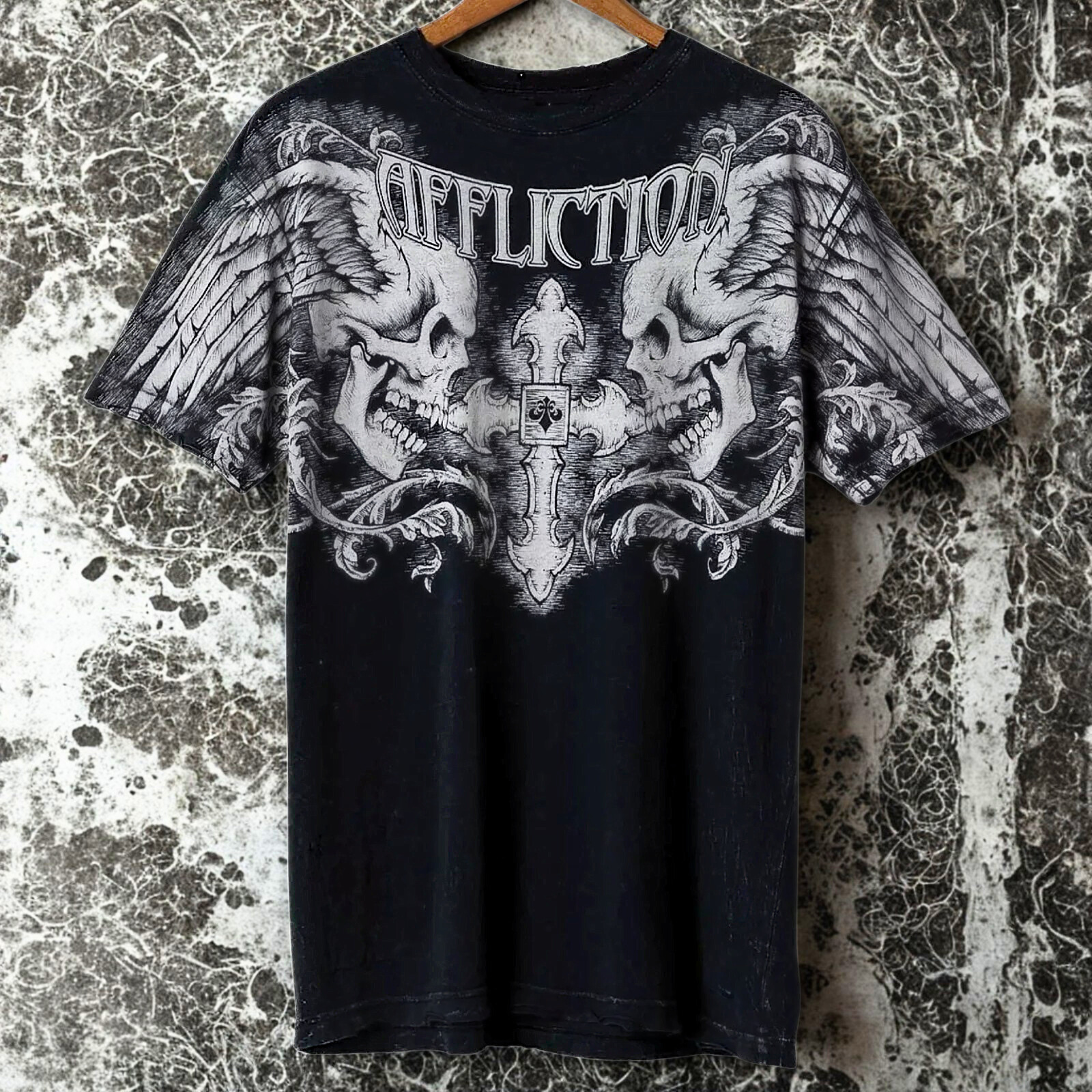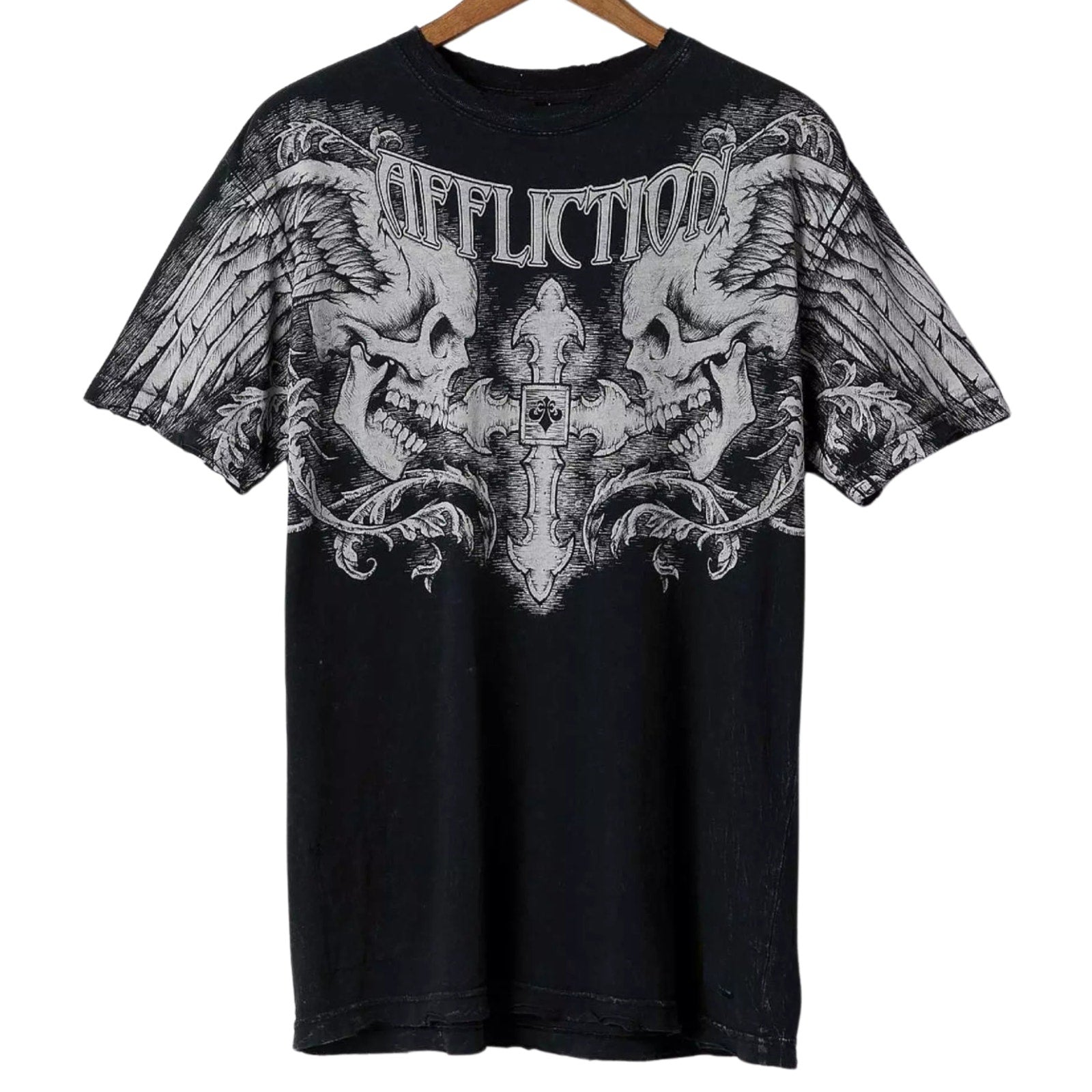 Affliction Gothic Cross Winged UP Skull T-Shirt Sz. XL Y2K Distressed UFC