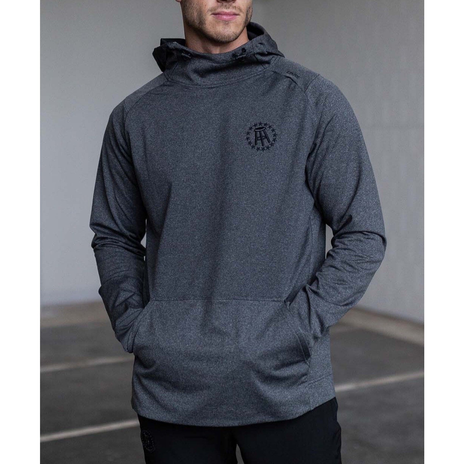 Crafted in a versatile gray tone, this hoodie features a crossover hood design for added coverage, a kangaroo pocket for utility, and a streamlined athletic cut that moves with you. Subtle branding includes the embroidered Barstool stool-and-stars crest at the chest and UNRL detailing at the shoulder, giving it a refined yet recognizable finish. Whether worn to the gym, on the move, or off-duty, this hoodie delivers comfort without sacrificing style.