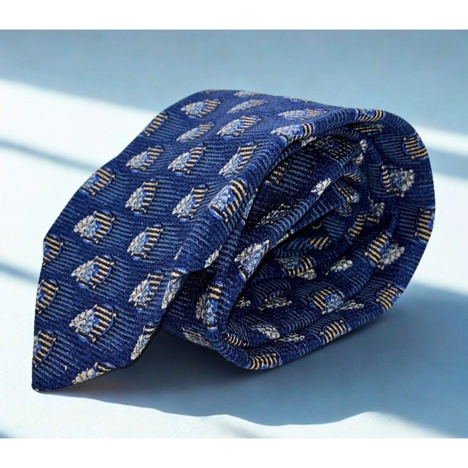 This tie features a rich navy blue textured ground with repeating woven medallions that read almost like miniature diamond crests. Each motif has a layered look — soft gold striping with light blue floral-like detailing — giving it dimension and subtle movement without overpowering the eye. The small-scale geometric pattern keeps it classic, while the intricate design adds personality.
