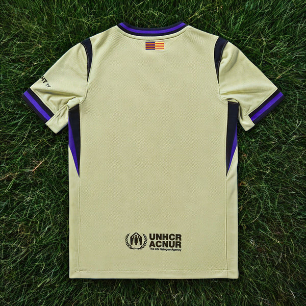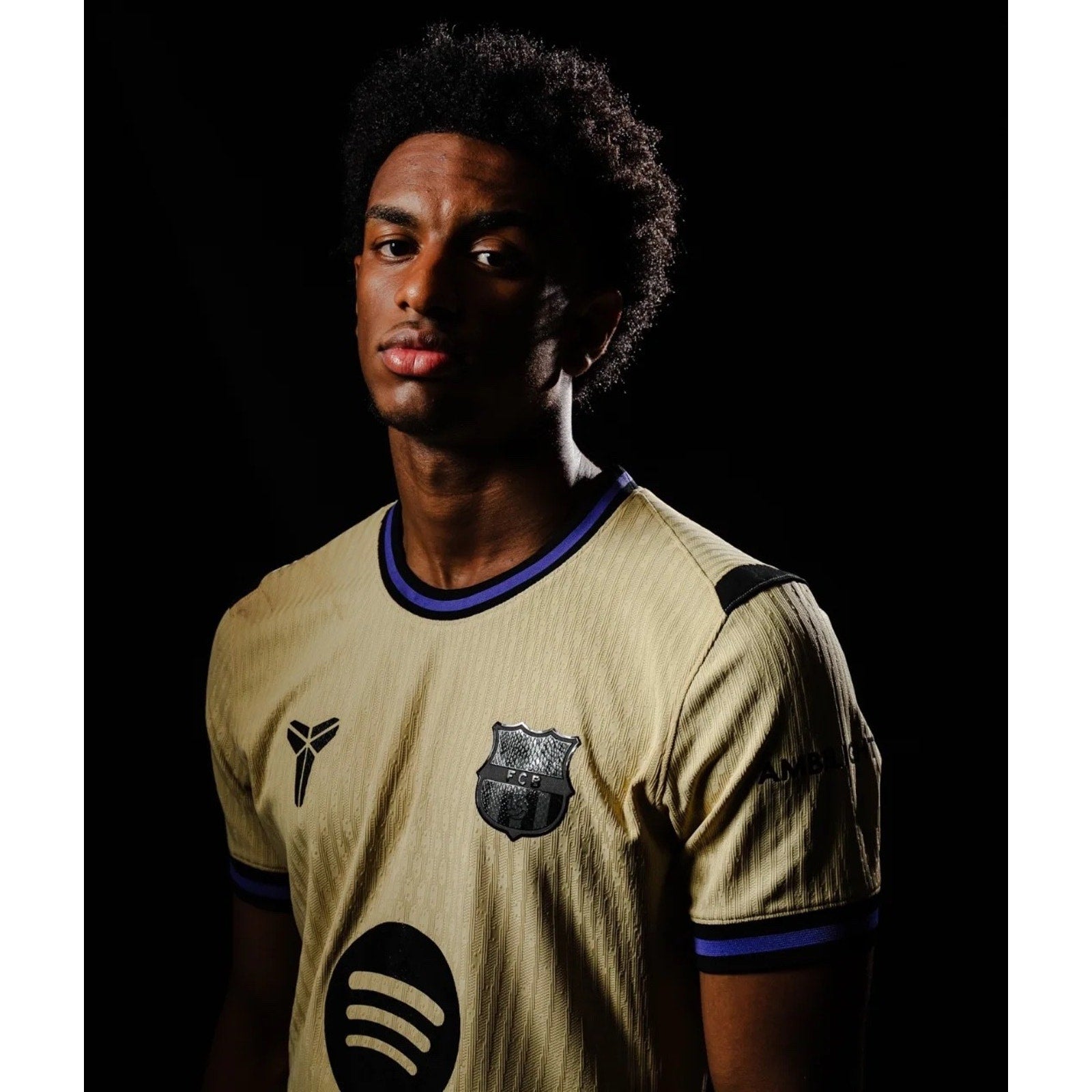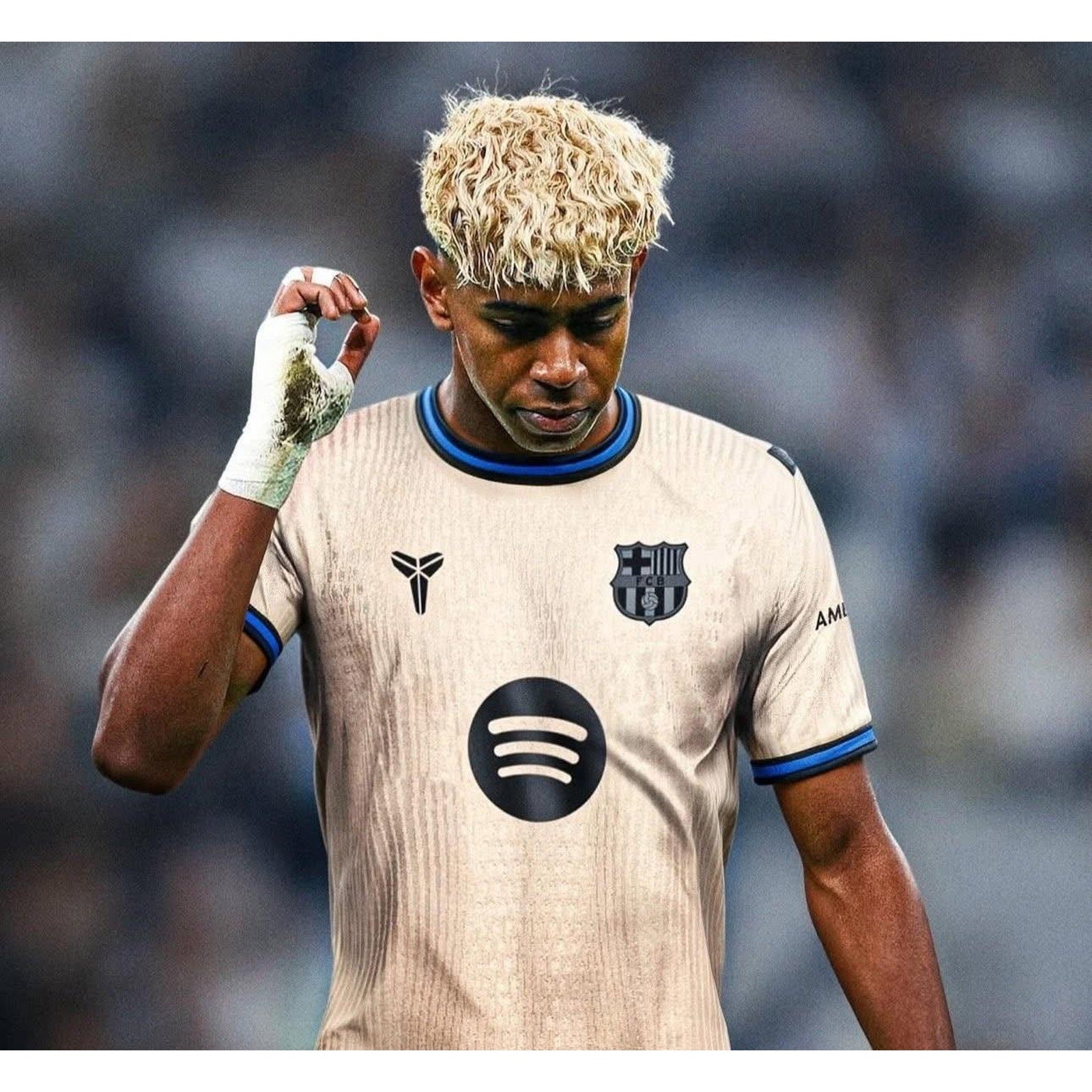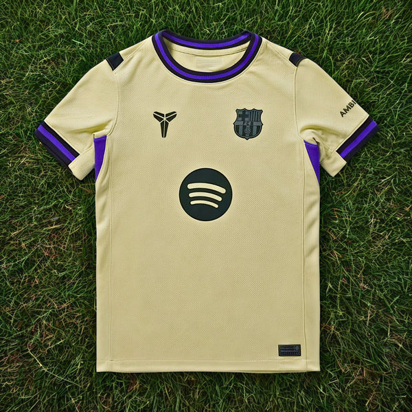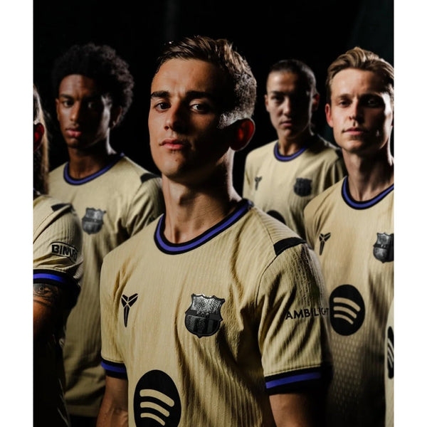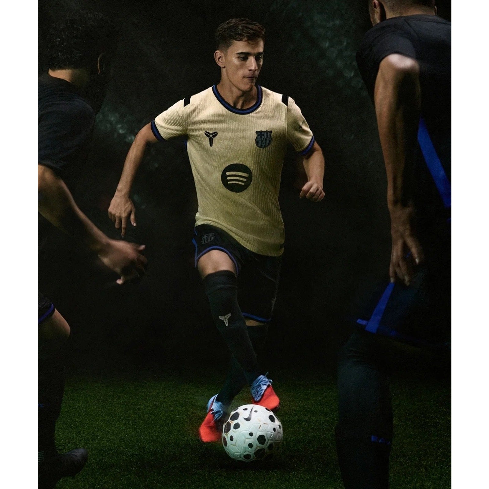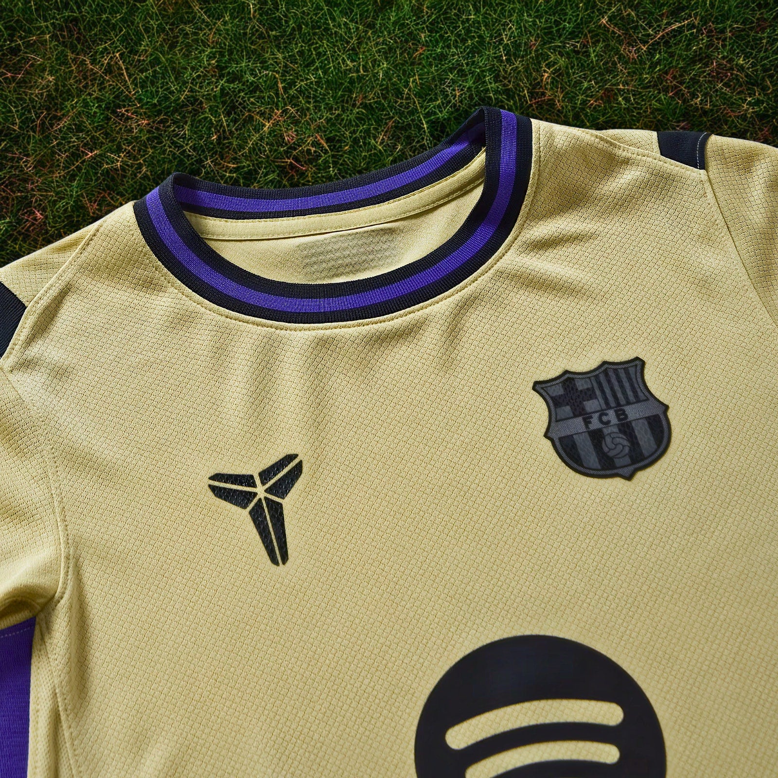 The sleek pale gold and black design pays tribute to Kobe’s legendary Lakers colors, while the Mamba logo replaces the Nike swoosh, blending Bryant’s legacy with Barça’s Catalan pride. The purple trim and understated Spotify sponsor print complete a design that merges basketball inspiration with football heritage.