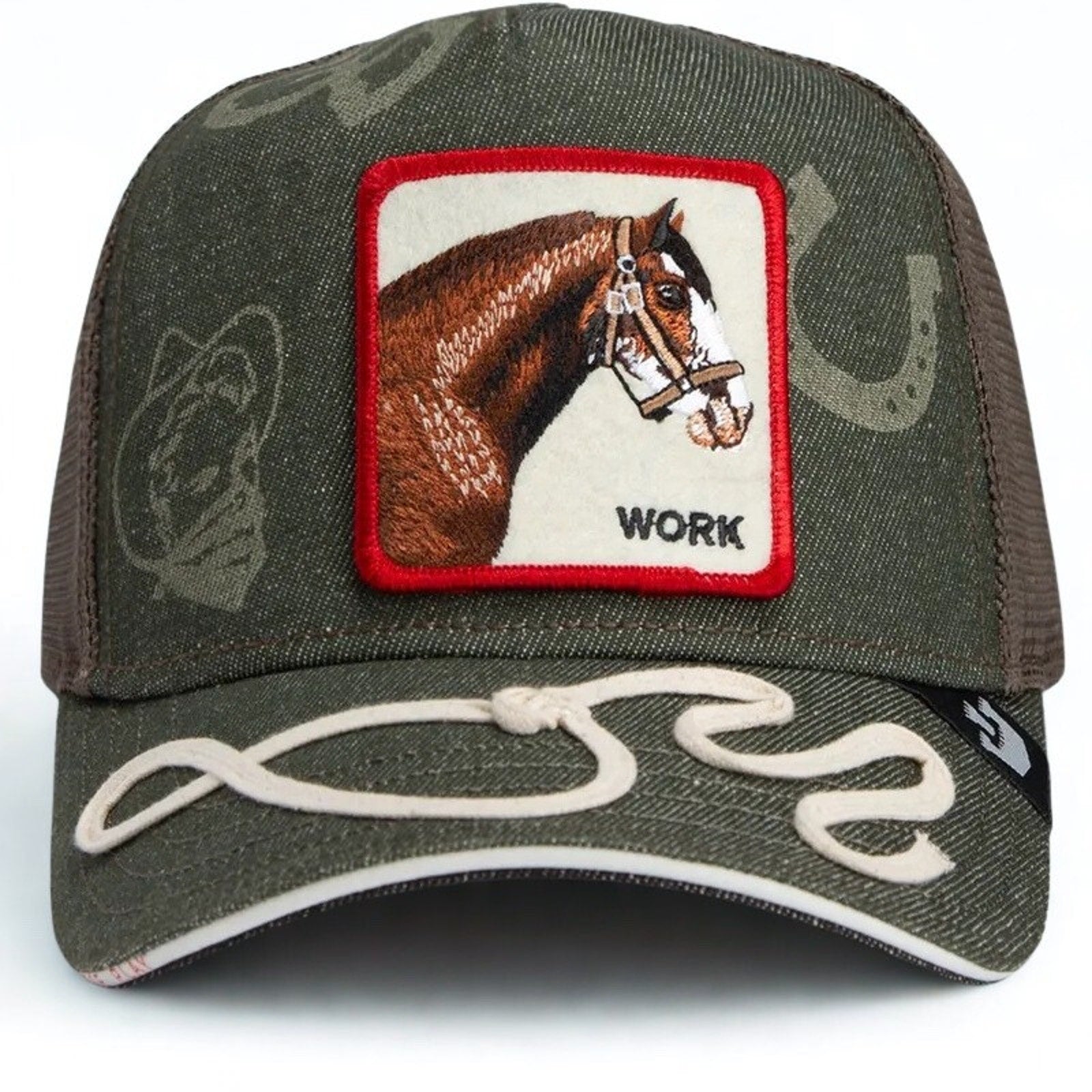 This olive A-Frame trucker features the iconic embroidered horse patch with “WORK” text — a symbol of hustle, grit, and getting things done. Finished with mesh backing for breathability and a curved brim with stitched lasso detailing, this is one of Goorin’s more unique Farm releases and harder-to-find colorways.