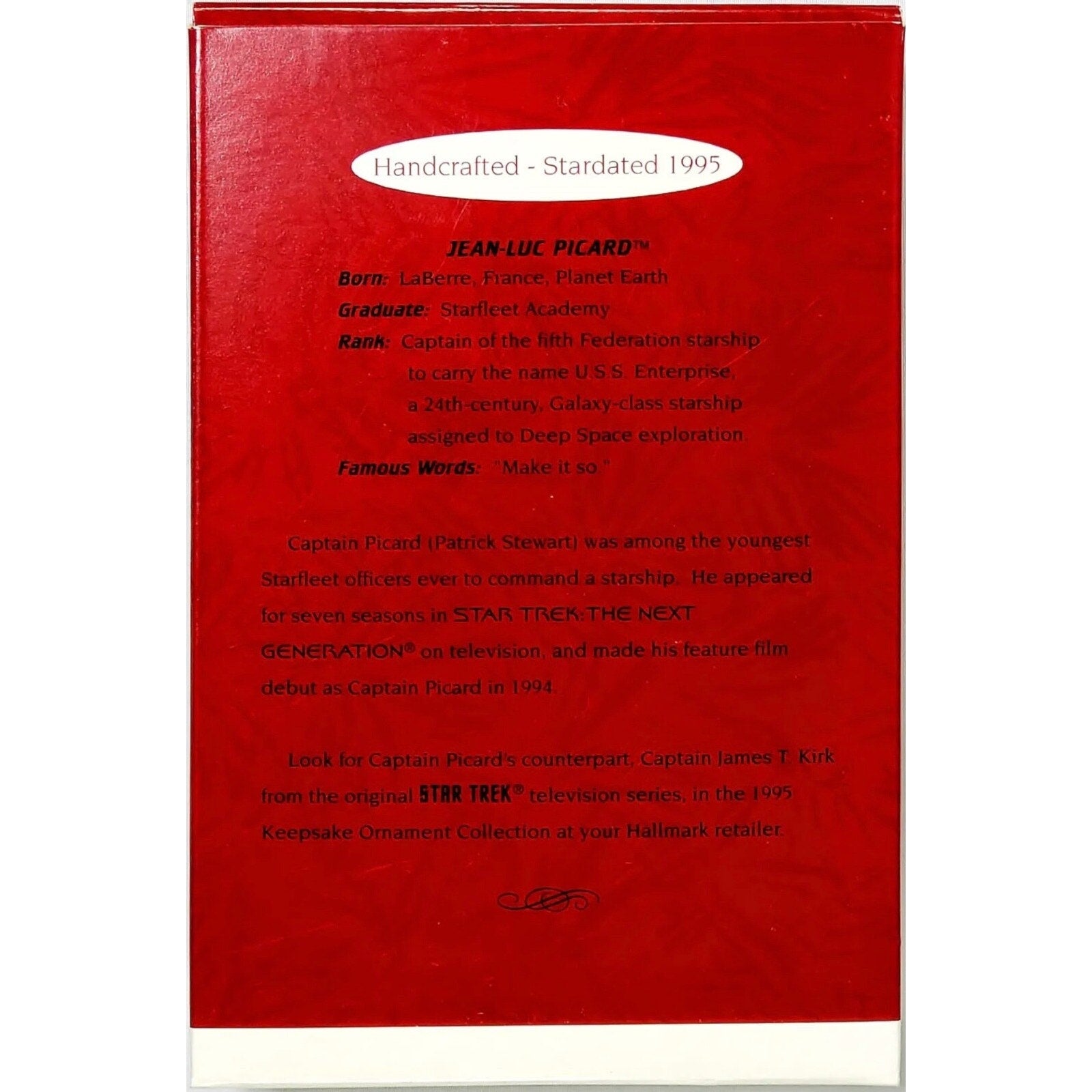 Add this Hallmark Keepsake Ornament to your collection today! Celebrate the holidays in style with this beautiful ornament featuring Captain Jean-Luc-Picard from the beloved Star Trek franchise. Made of high-quality plastic, this ornament is durable and perfect for years to come. The attention to detail on this ornament is impressive, with intricate designs and vibrant colors that make it a true standout piece. Whether you're a fan of Star Trek or simply looking for a unique addition to your holiday decor, this Hallmark Keepsake Ornament is sure to impress.