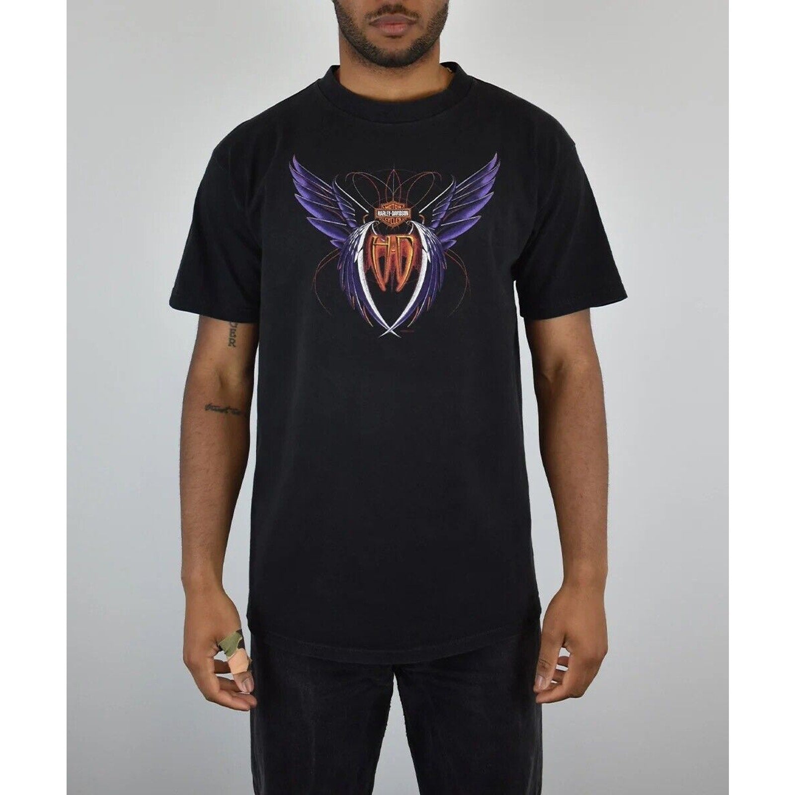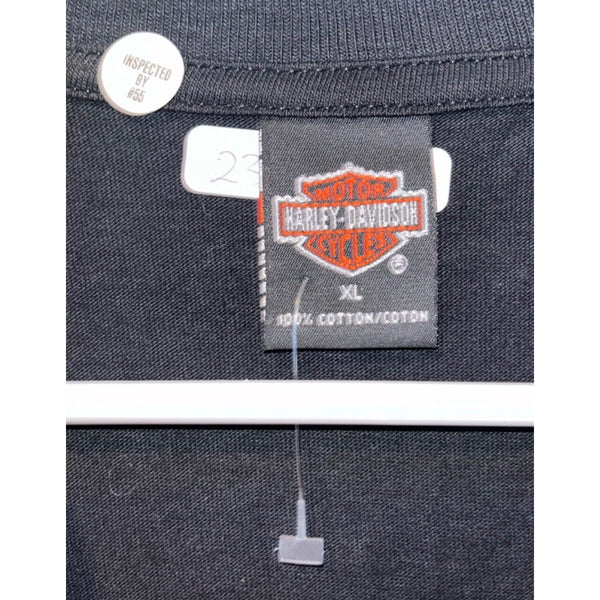 Rev up your wardrobe with this rare, double-sided Harley Davidson Baltimore, Maryland Bald Eagle USA XL T-Shirt. Featuring a crew neckline and short sleeves, this vintage graphic tee is made from 100% cotton and is machine washable. The shirt is adorned with the iconic Harley Davidson logo and a patriotic bald eagle design, perfect for any motorcycle enthusiast or lover of all things USA. This unisex adults t-shirt is a must-have for any Harley Davidson fan and is sure to turn heads with its unique design. Whether you're hitting the open road or just hanging out, this shirt is perfect for any occasion. Don't miss out on this rare find from the Harley Davidson product line.