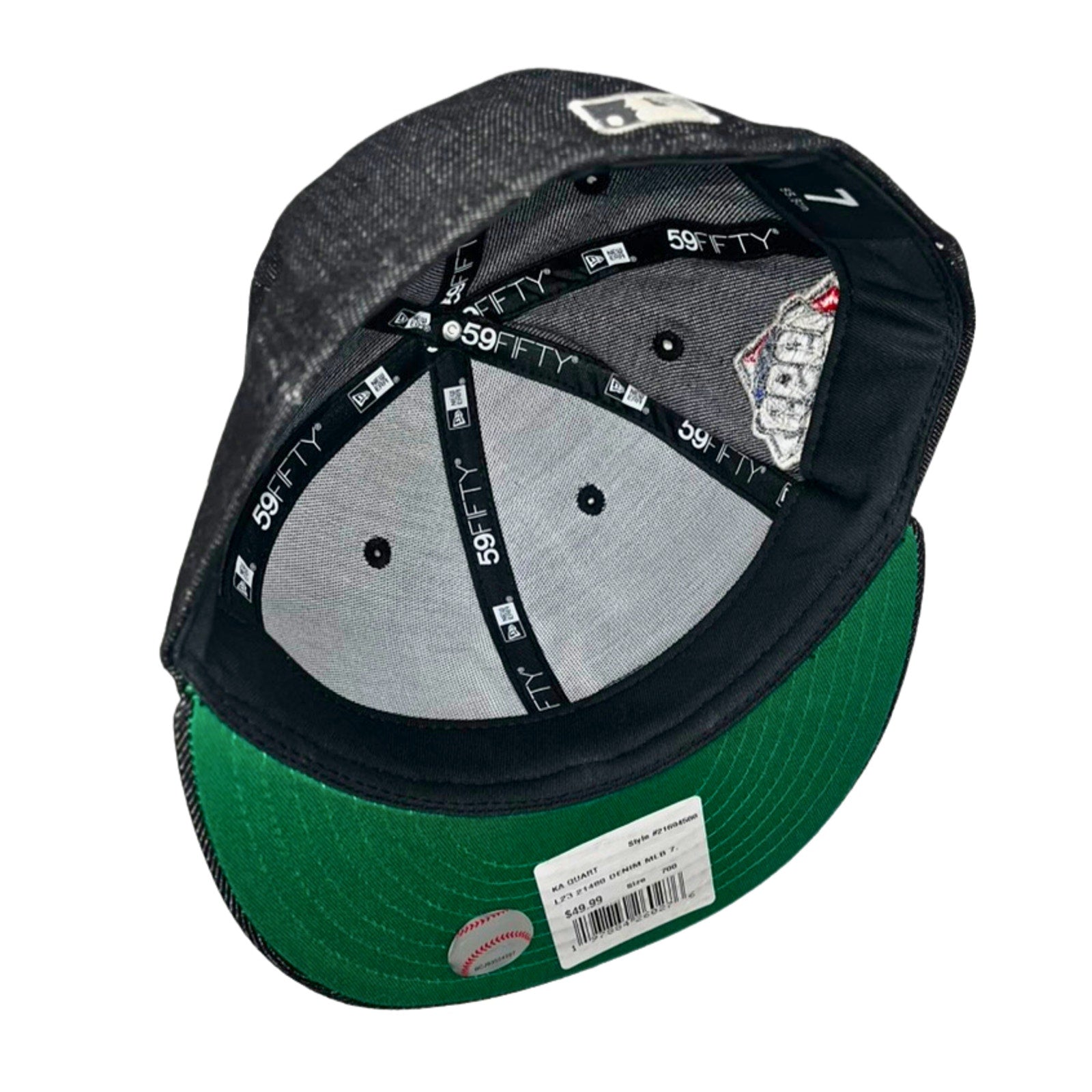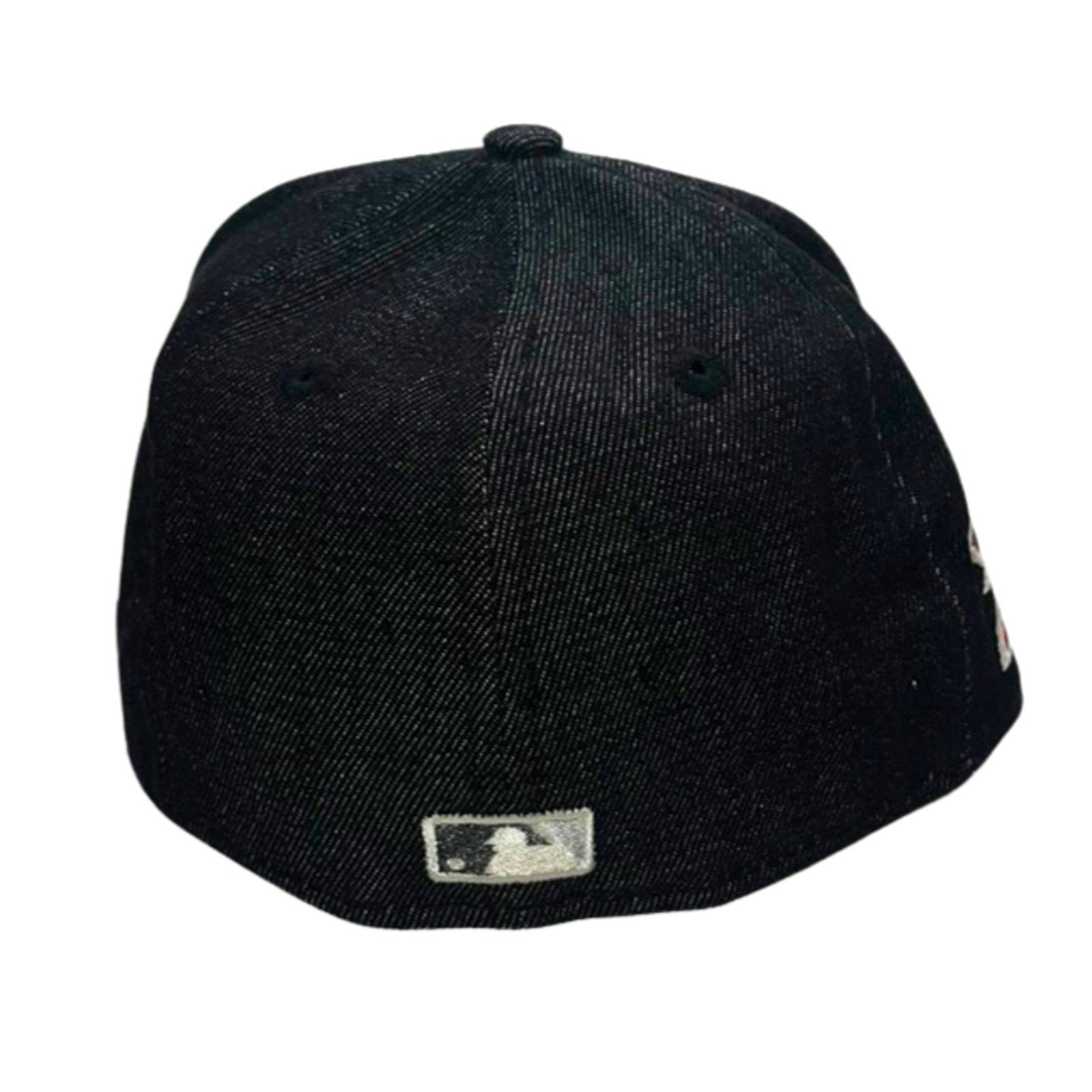 The New York Yankees Denim Hat by New Era is an officially licensed baseball cap featuring the iconic Yankees team logo. This black 1999 World Series cap is designed in a size 7, perfect for unisex adult fans looking to show their support for the Major League Baseball team. Made in the Lao People's Democratic Republic, this cap is a stylish and unique addition to any fan's apparel collection.