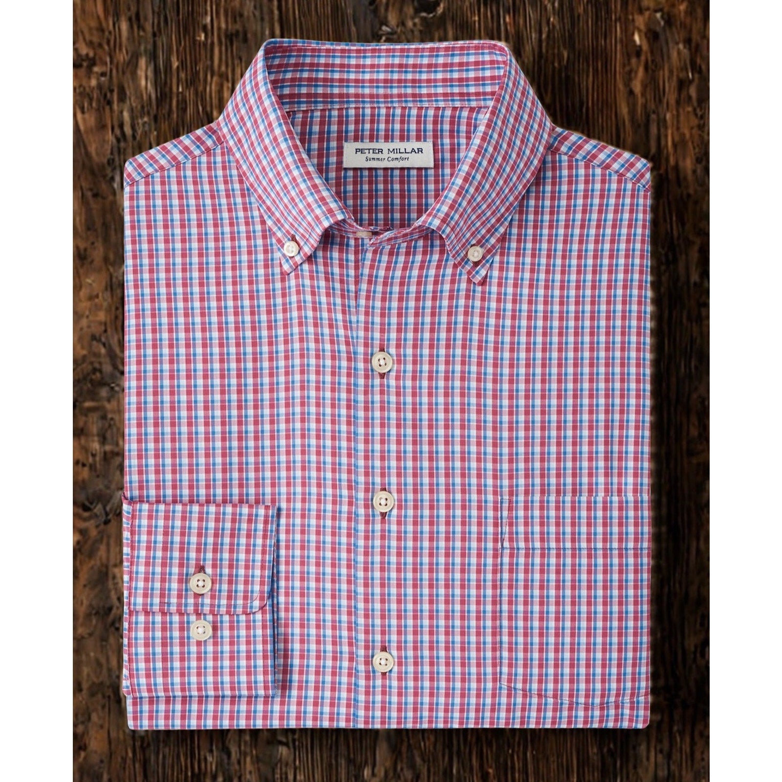 This Peter Millar Crown Sport Summer Comfort Ashbury performance sport shirt blends classic style with modern technical fabric. Featuring a refined plaid pattern in red, blue, and white, this versatile shirt works perfectly for the office, golf course, travel, or everyday wear.