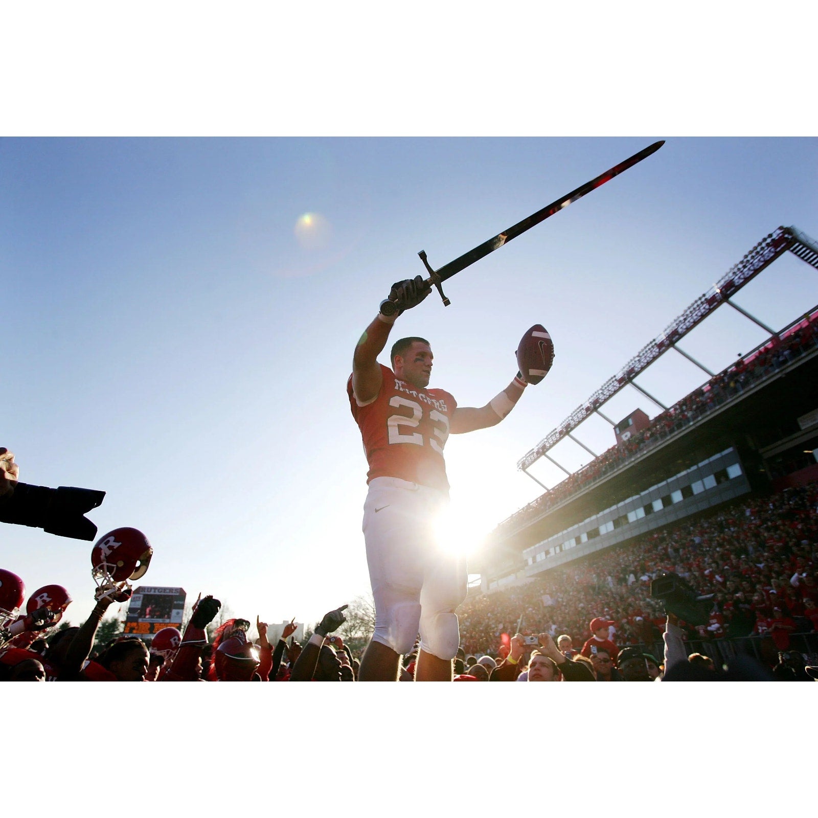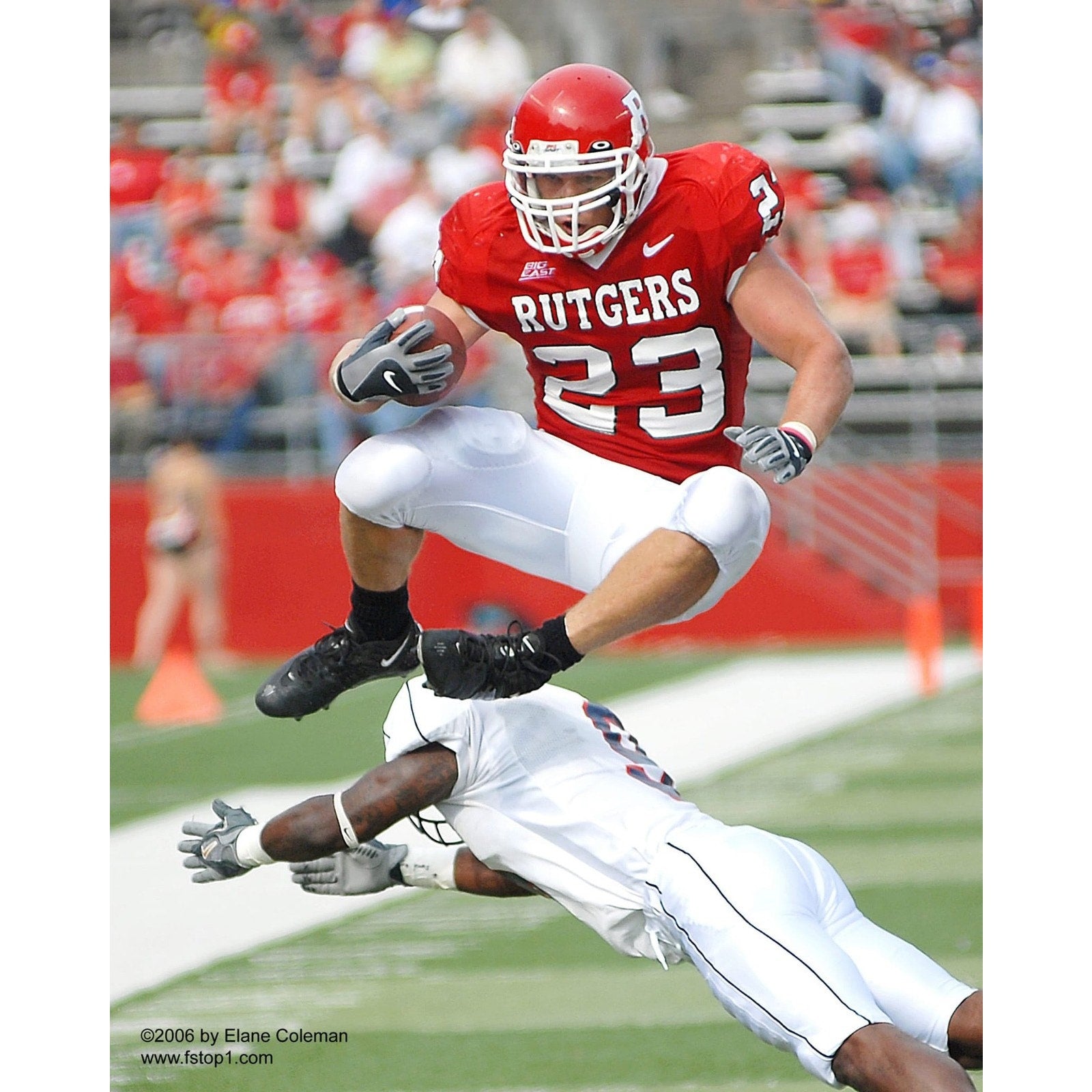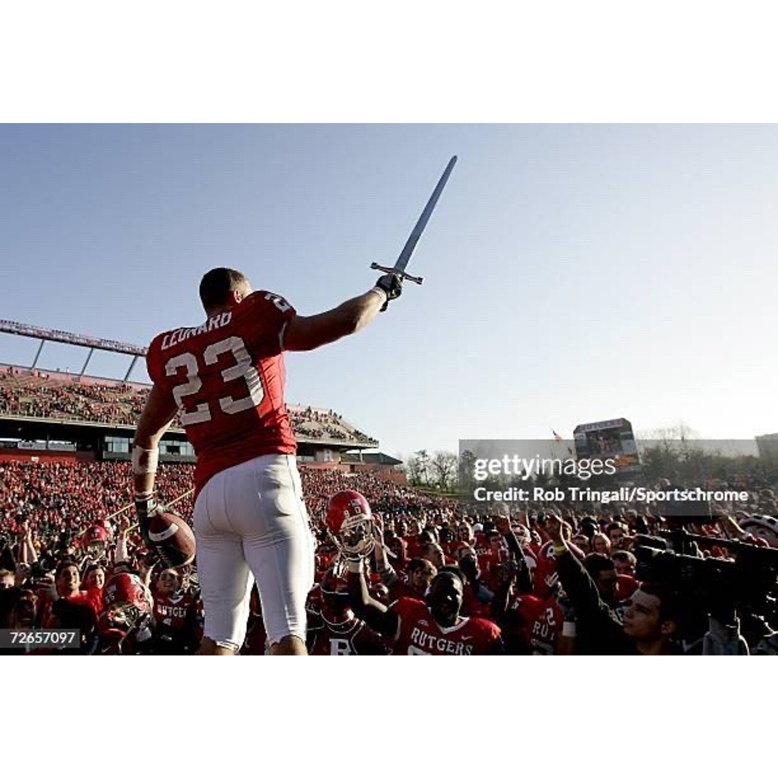 Finished in classic Rutgers scarlet red with bold #23 numbering, this piece captures the era when Brian Leonard helped elevate Rutgers football into the national spotlight.