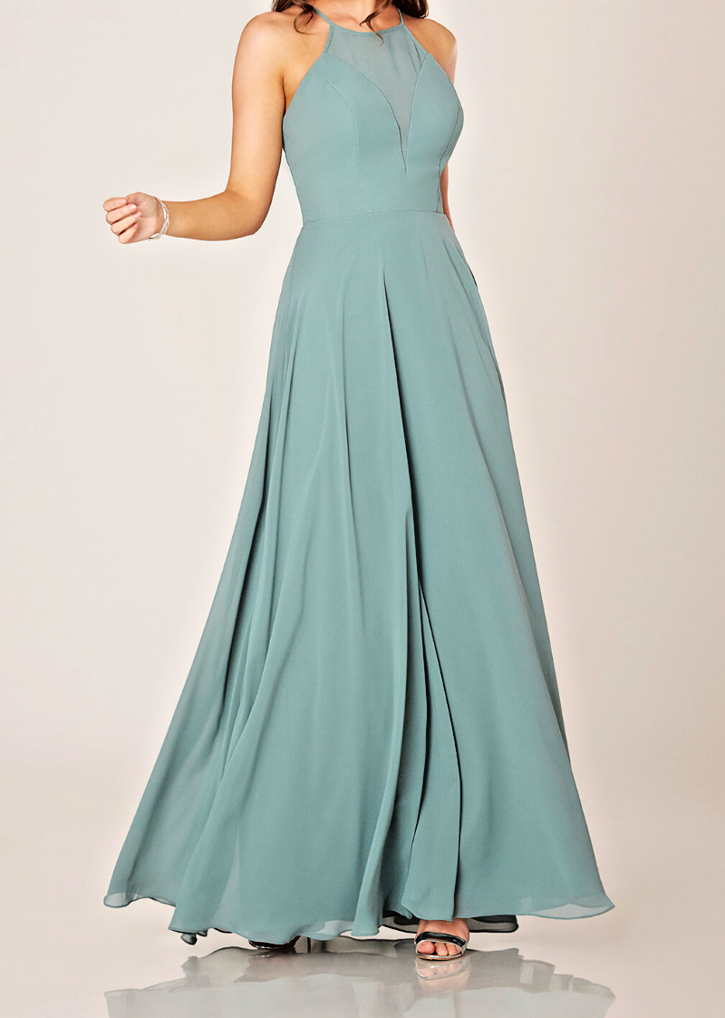 Expect the unexpected with this totally unique bridesmaid gown from Sorella Vita! An on-trend high halter neckline takes this style to the next level with a sheer mesh paneling, laying atop solid V-neckline plunge. The back of the bodice features a narrow keyhole element for another twist of daring detail, complemented by the slightly fuller hem of the lush chiffon skirt—making this gown a dream for every bold and beautiful bridesmaid.