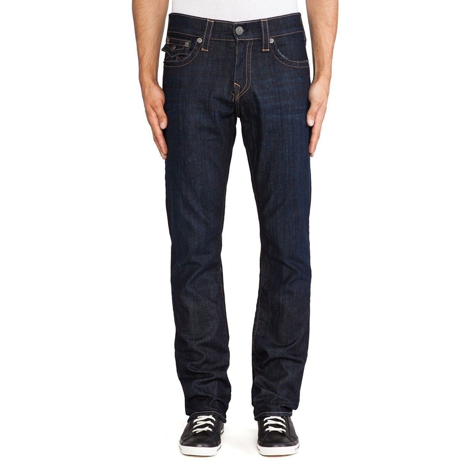 The jeans are made from 98% cotton and 2% elastane, providing durability with comfortable flexibility. The dark blue denim is complemented by True Religion’s signature golden contrast stitching, brushed silver hardware, and the iconic leather logo patch on the waistband.