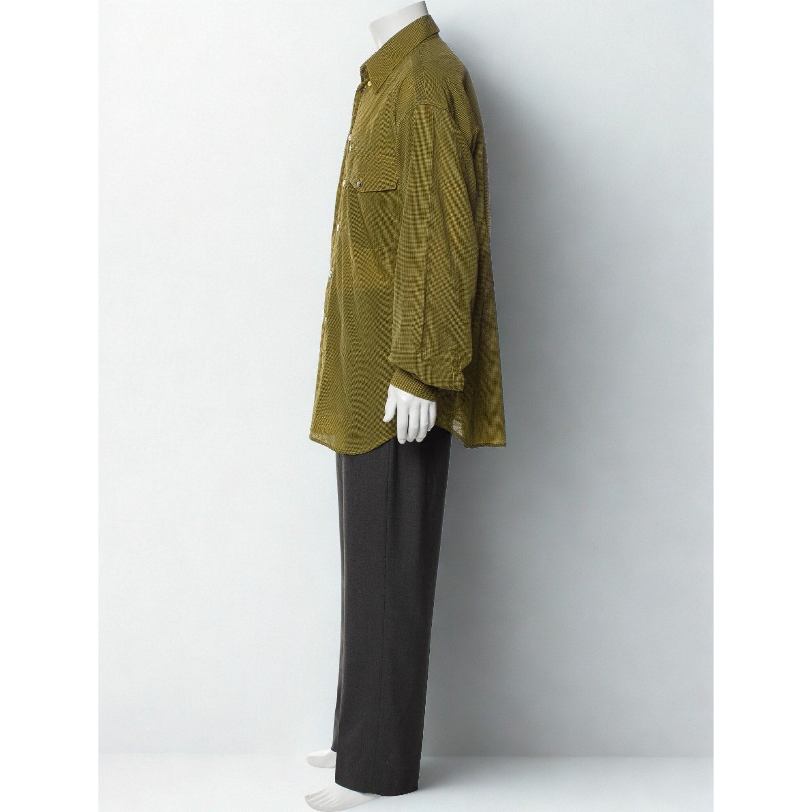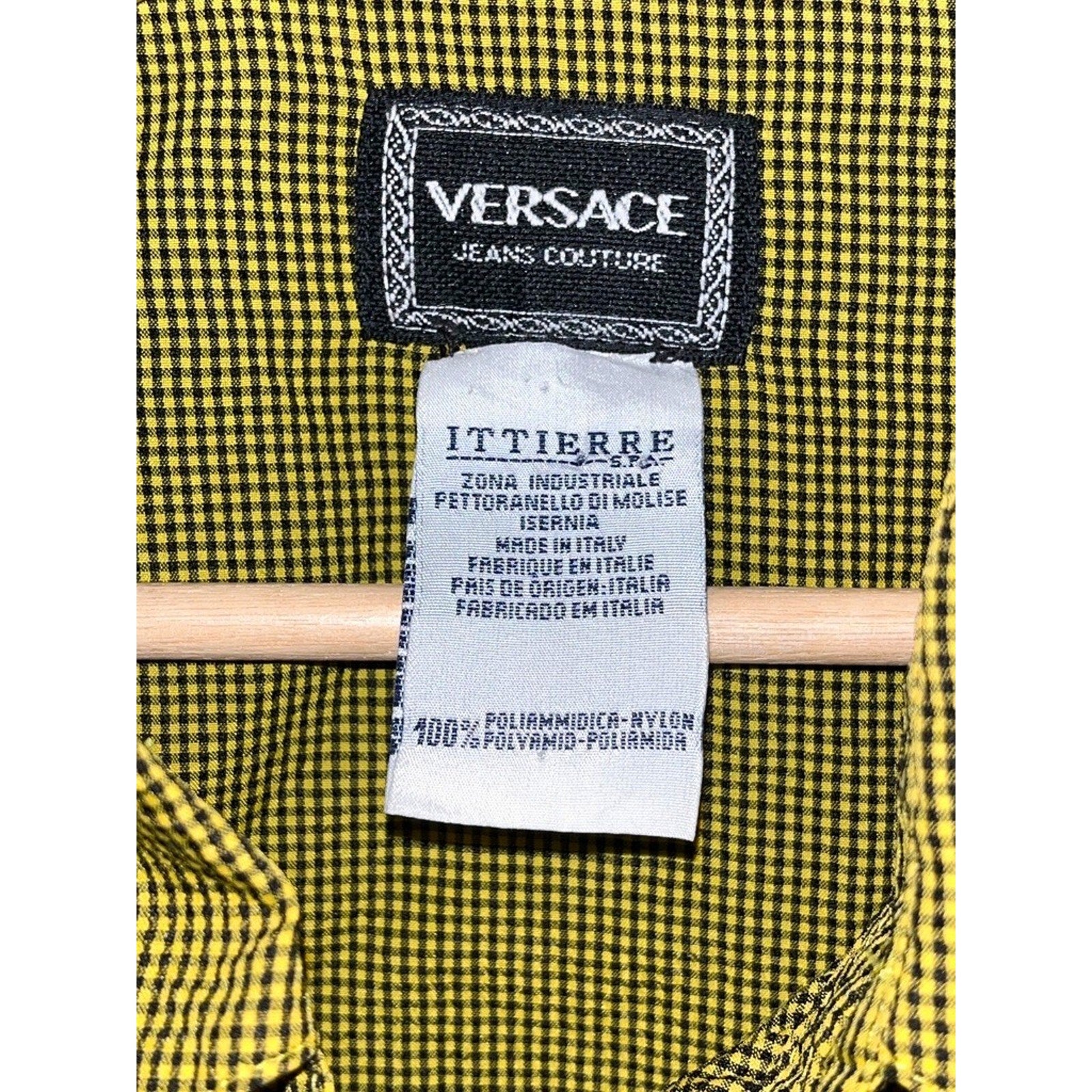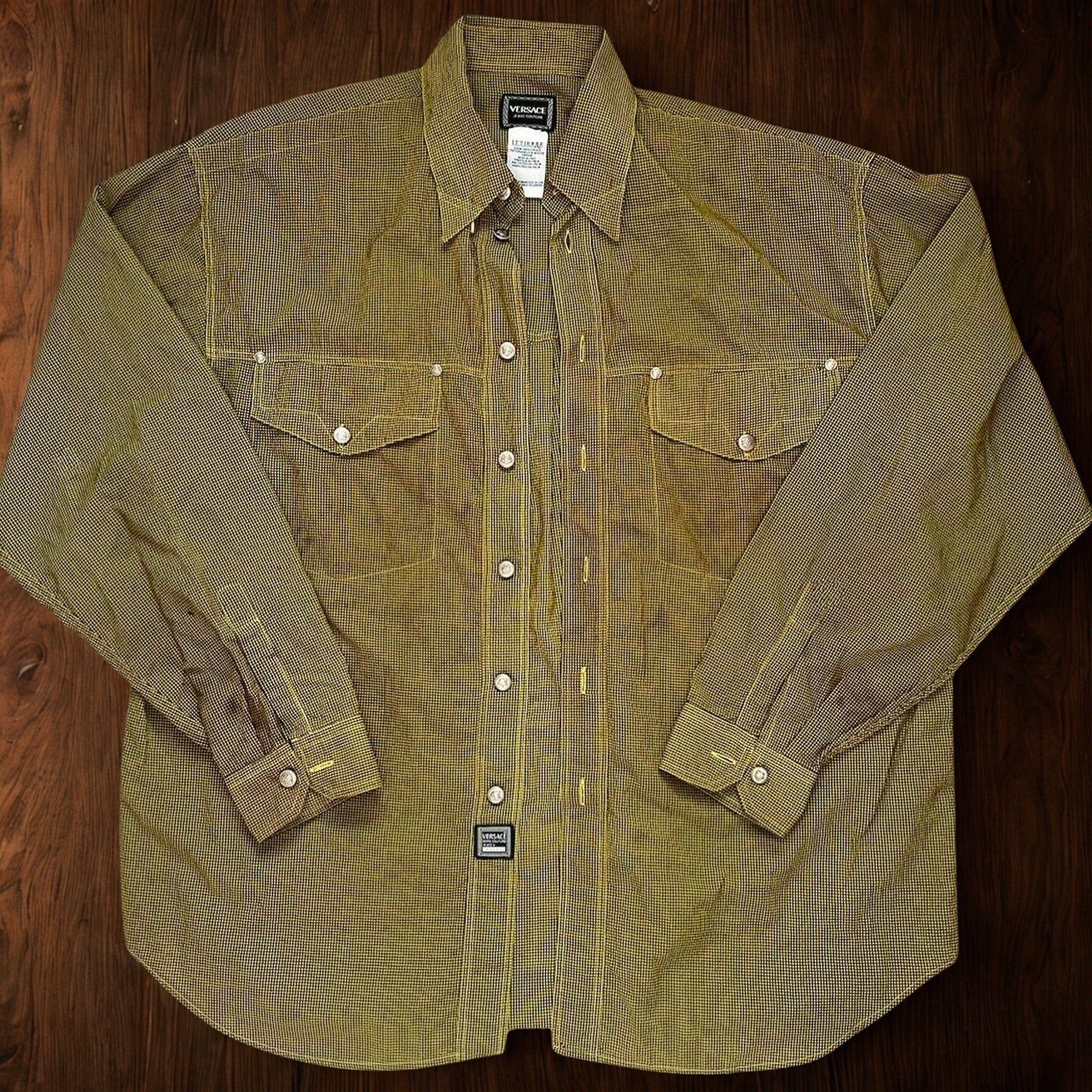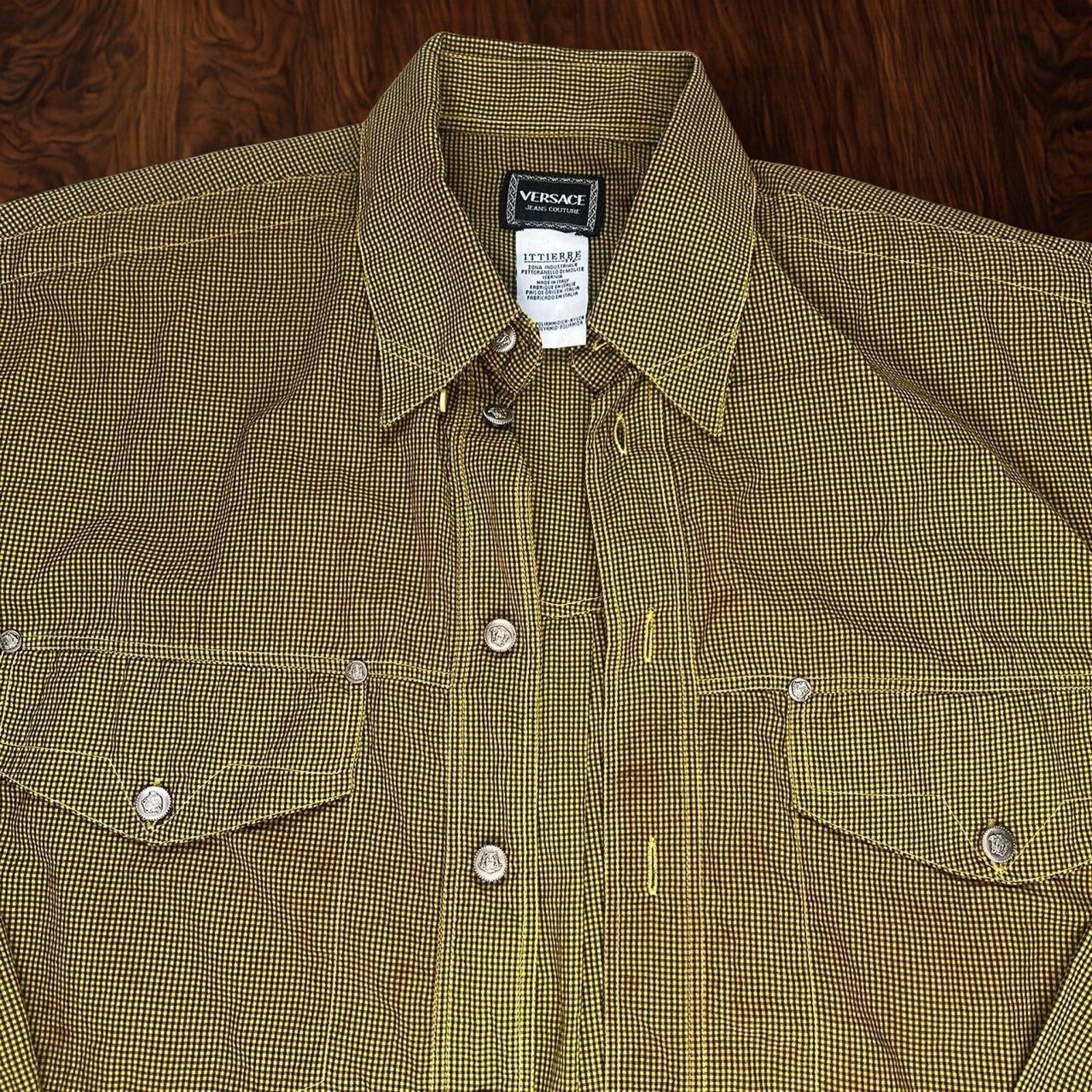 This authentic Versace Jeans Couture button-up shirt hails from the 1990s Italian-made Ittierre Spa era, a period highly regarded by collectors for its superior construction, bold patterns, and unmistakable Versace attitude. Featuring a sharp black and yellow micro-plaid print, this piece blends luxury fashion with utilitarian design details.