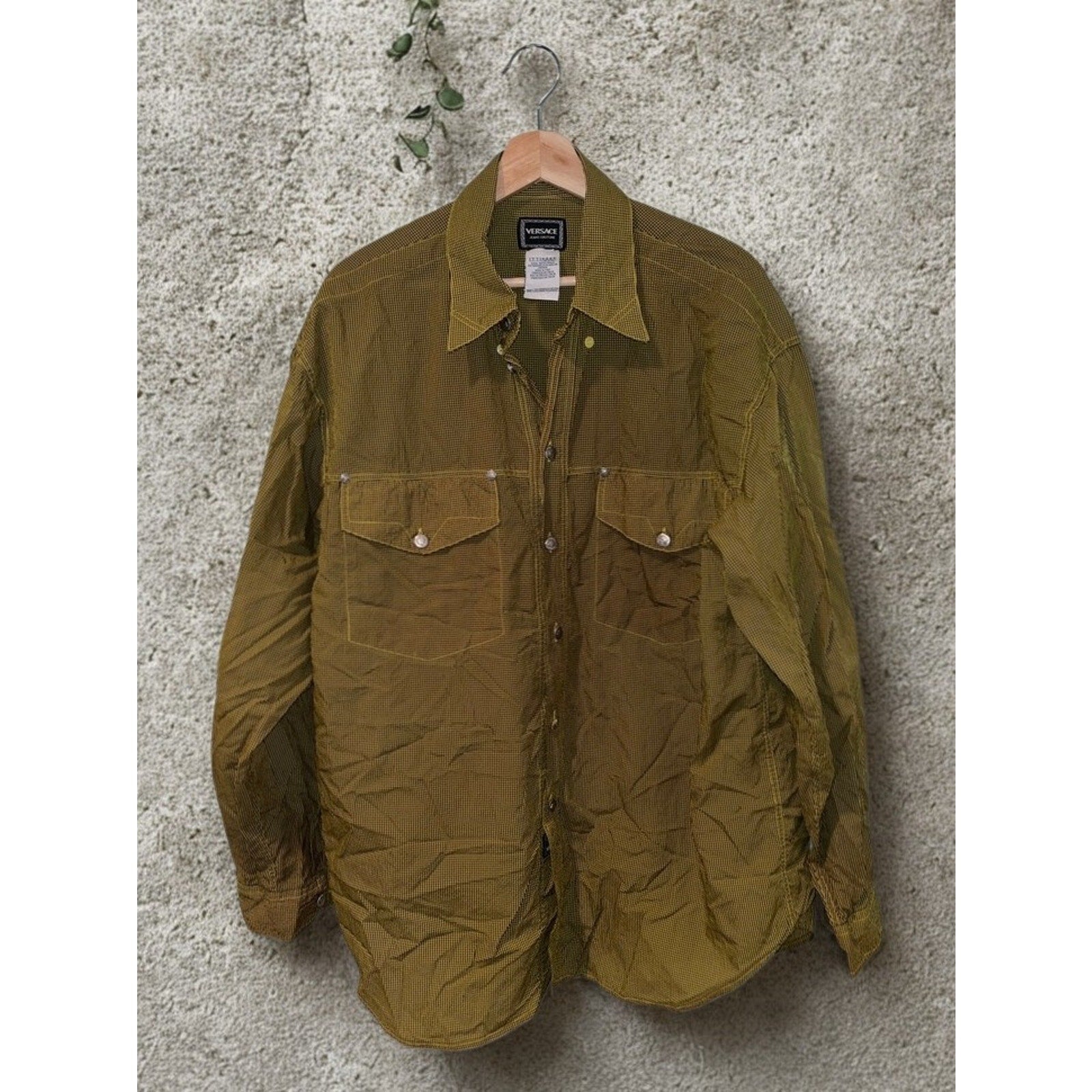 Crafted in Italy and finished with signature Medusa head snap buttons, the shirt offers a structured yet wearable silhouette. Dual flap chest pockets, a point collar, and long sleeves with one-button mitered cuffs complete the classic Versace Jeans Couture look. A standout vintage piece that works effortlessly styled open over a tee or buttoned up for a sharper statement.