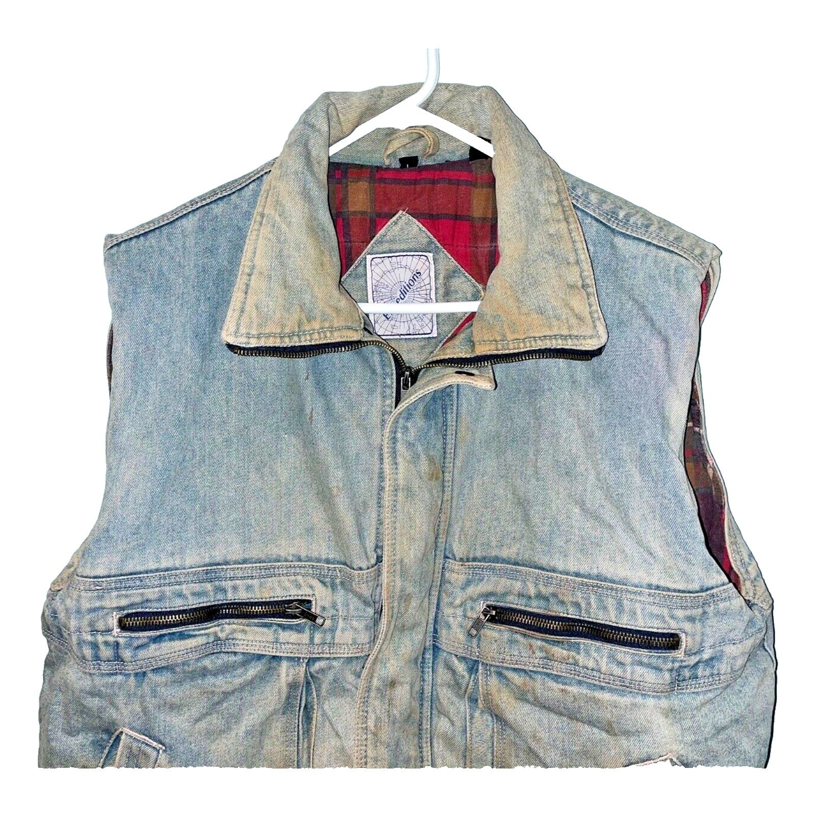 Vtg 90s Streetwear Mens L Distressed Flannel Lined Acid Wash Denim Vest Jacket
